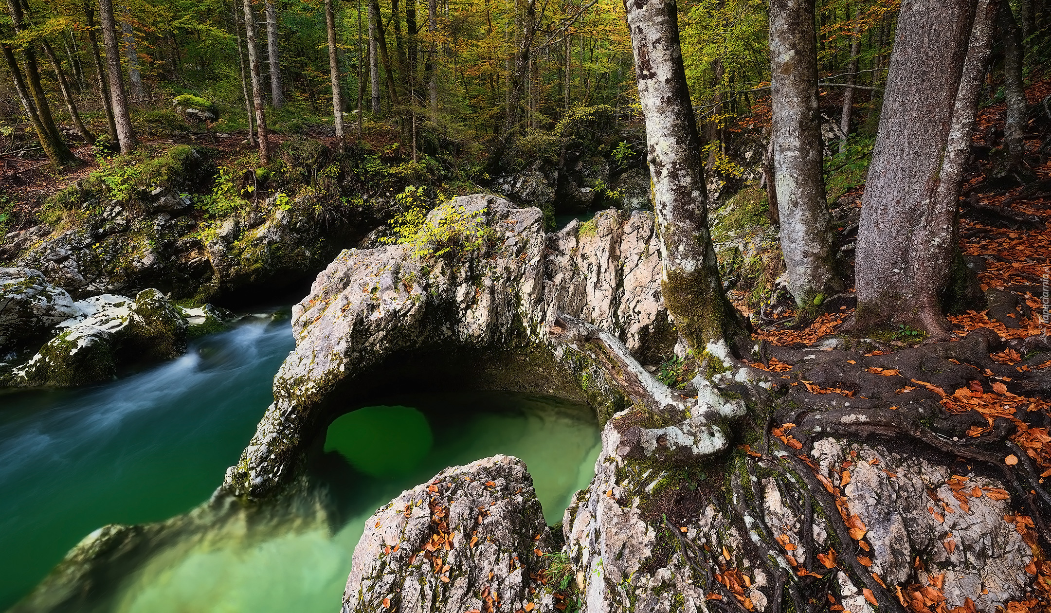 Edytor tapety: Drzewa na skałach nad leśną rzeką