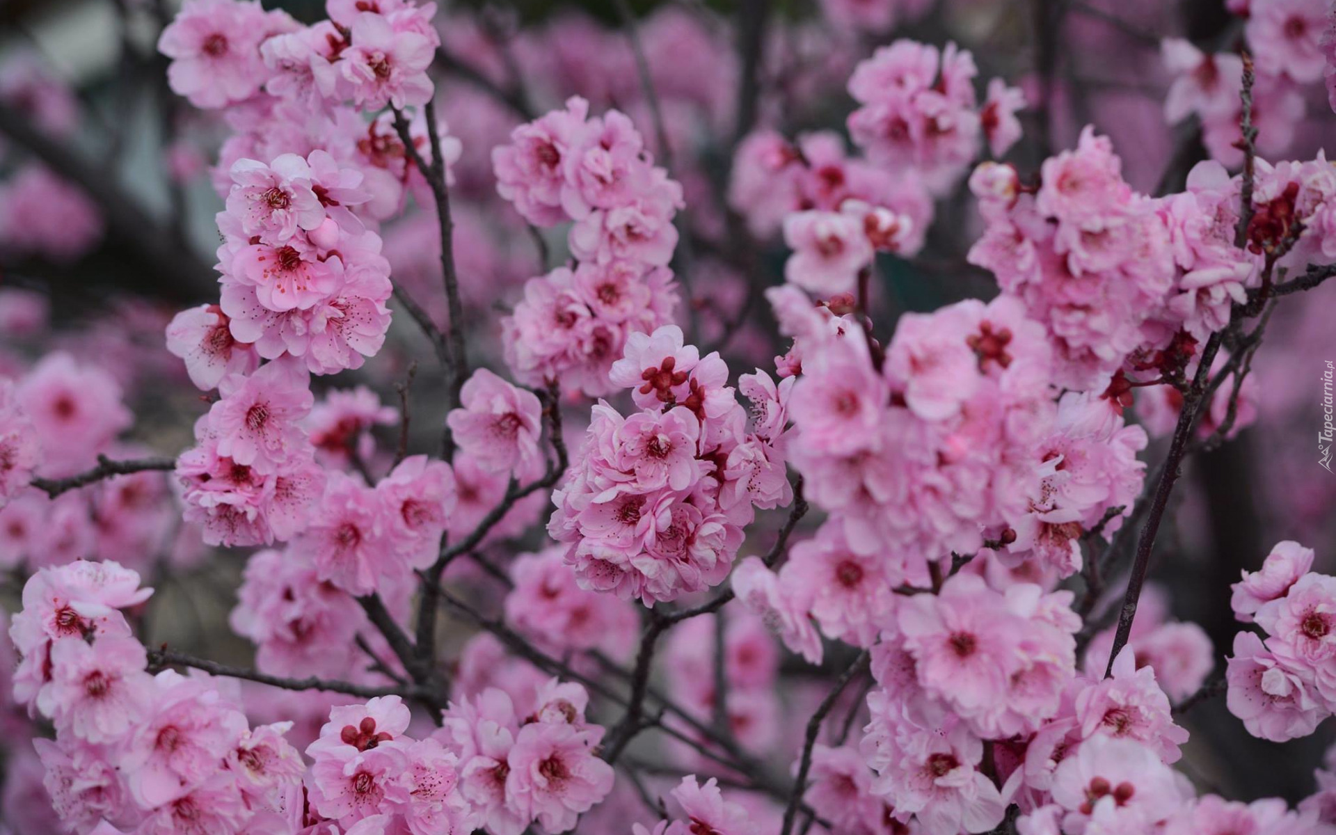 Edytor tapety: Różowe kwiaty wiśni na gałązkach w zbliżeniu