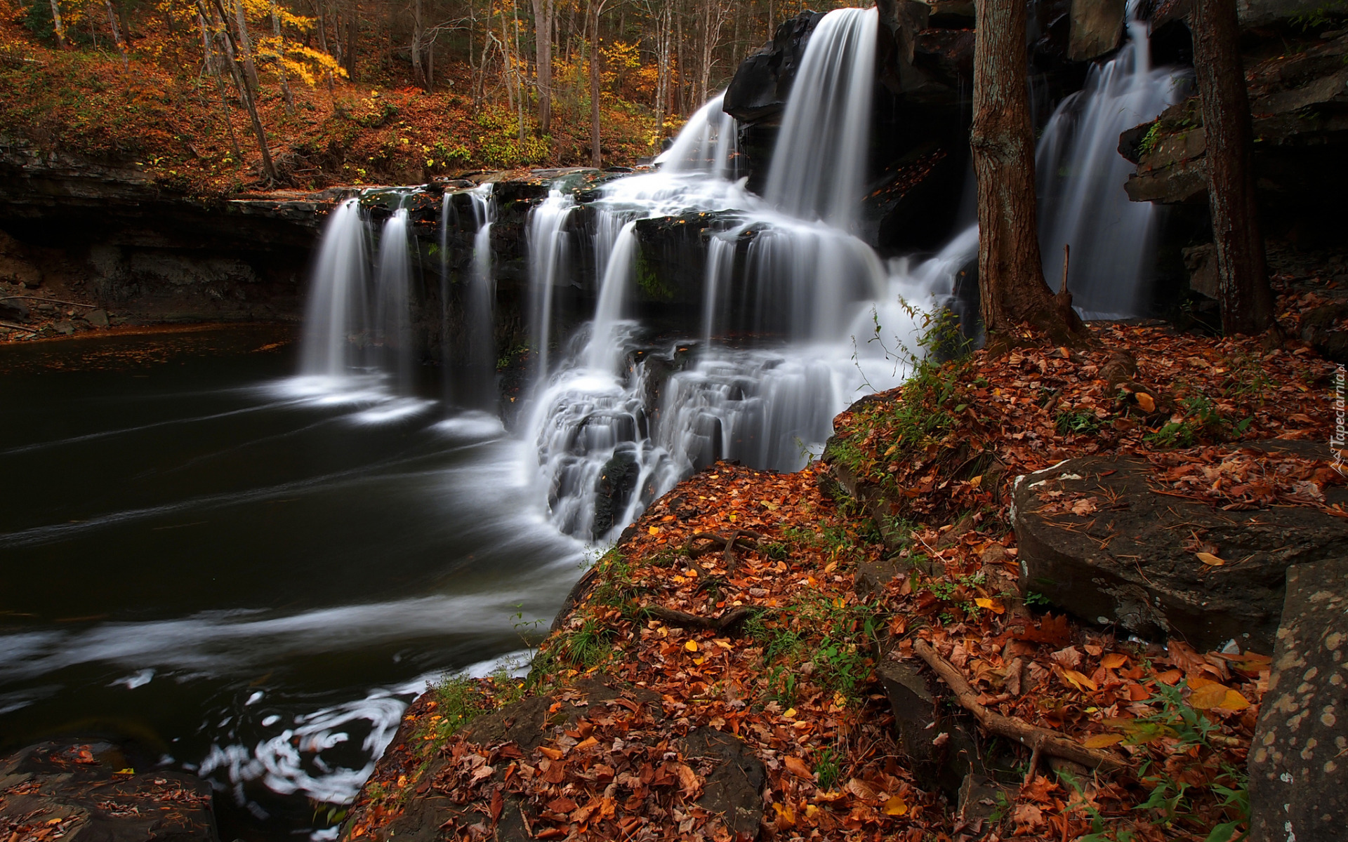Edytor tapety: Opadłe liście na skałach obok wodospadu
