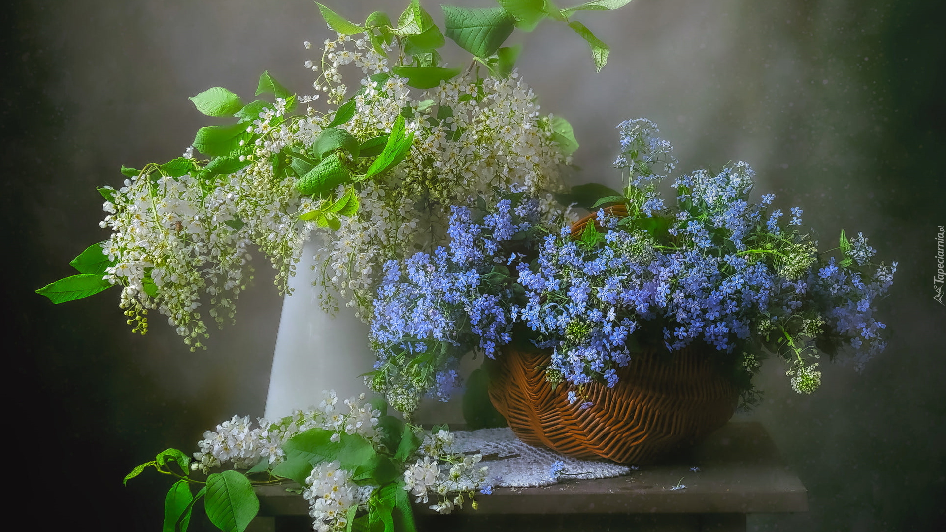 Edytor tapety: Czeremcha w wazonie i niezapominajki w koszyku