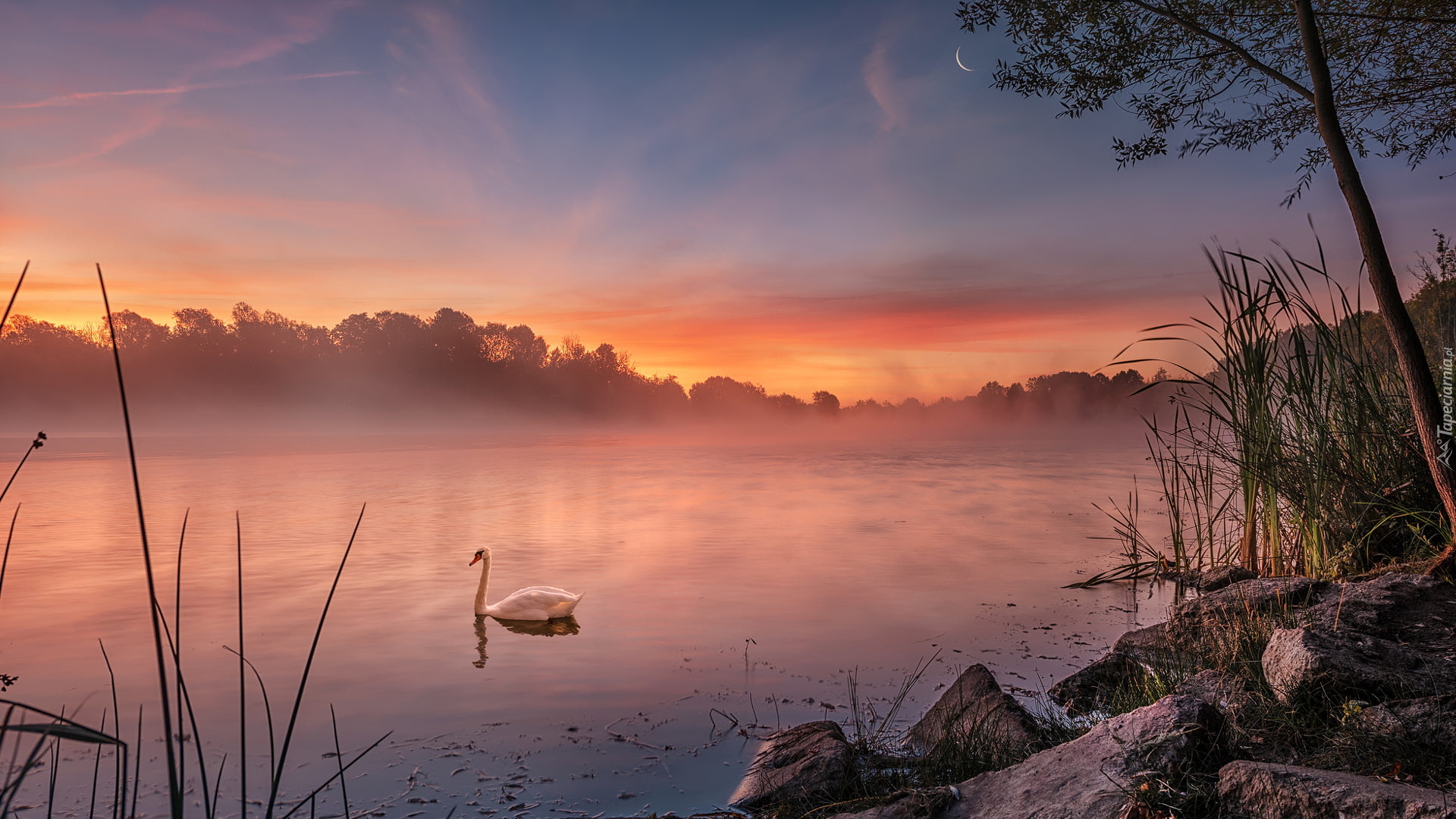 Edytor tapety: Biały łabędź na zamglonym jeziorze
