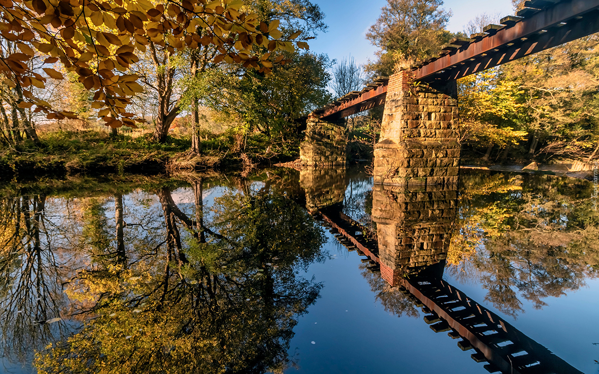 Edytor tapety: Odbicie mostu i jesiennych drzew w rzece