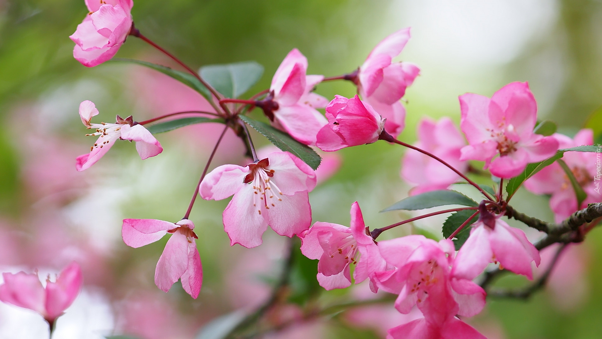 Edytor tapety: Różowe kwiaty na gałązkach w zbliżeniu