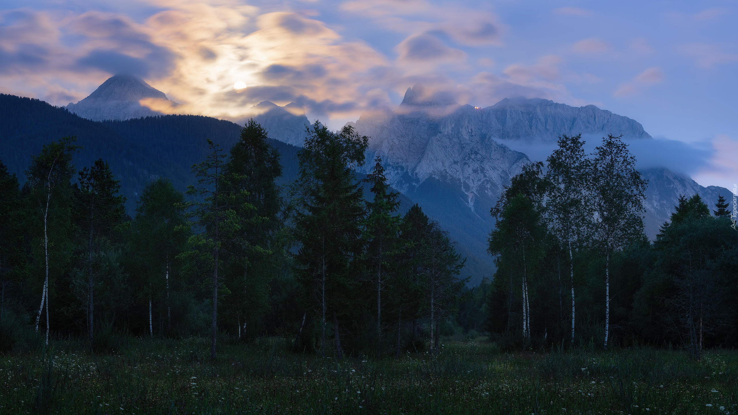 Edytor tapety: Drzewa na polanie i góry Karwendel