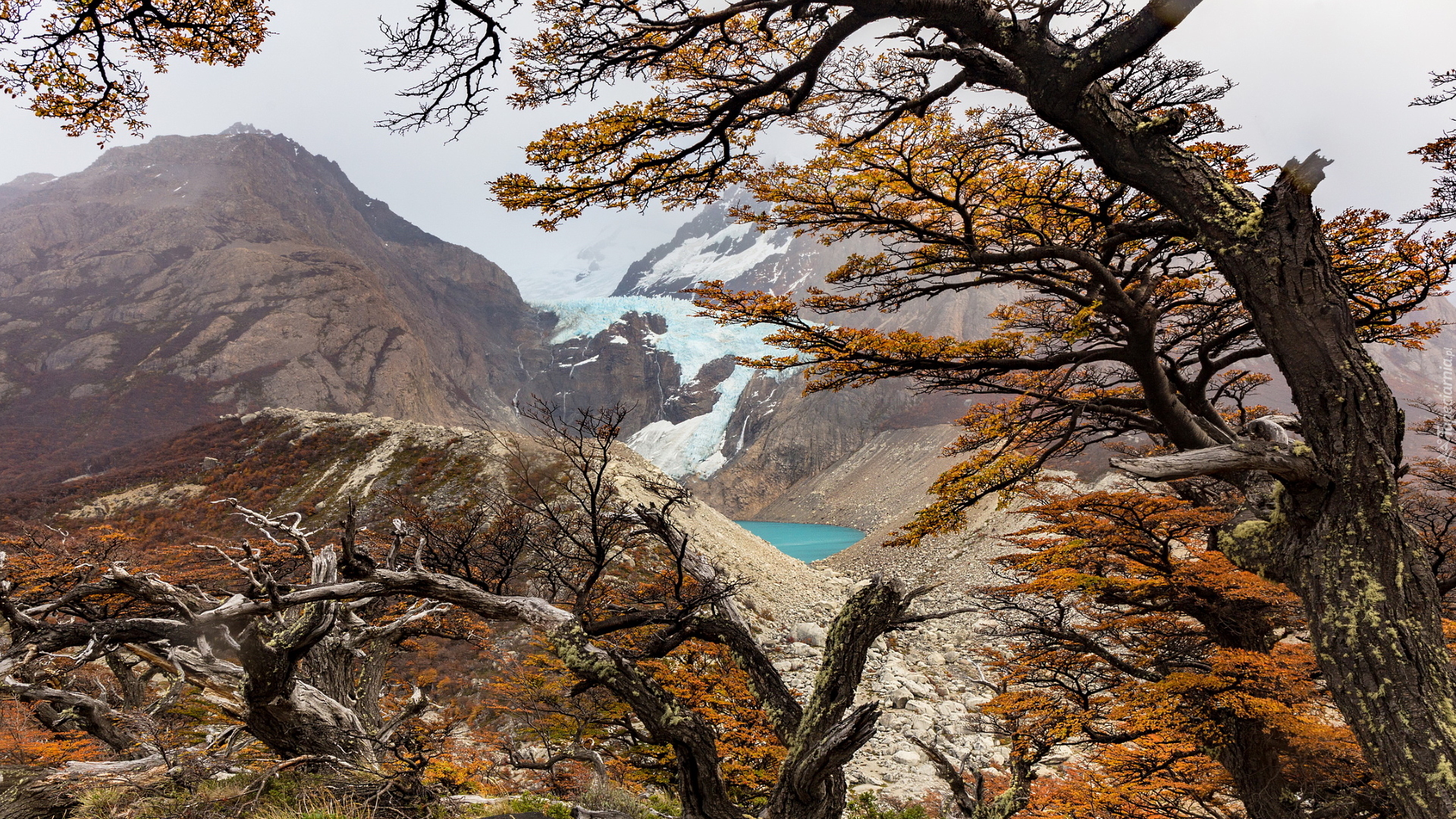 Edytor tapety: Widok zza drzew na lodowiec Perito Moreno