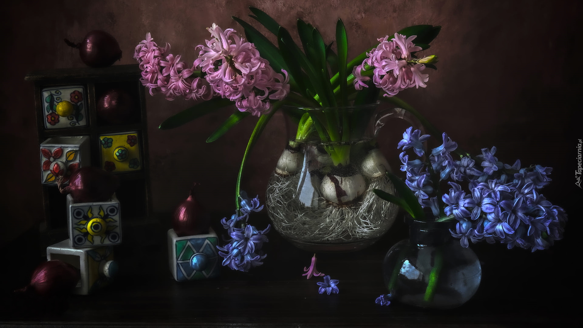 Edytor tapety: Różowe i niebieskie hiacynty w wazonach