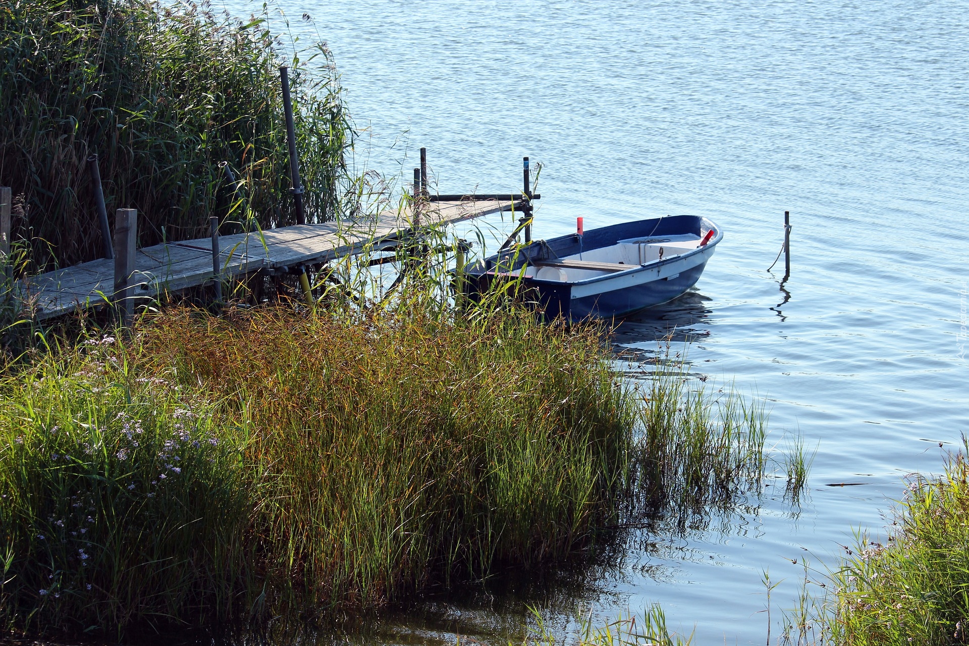 Edytor tapety: Łódka obok pomostu i szuwarów