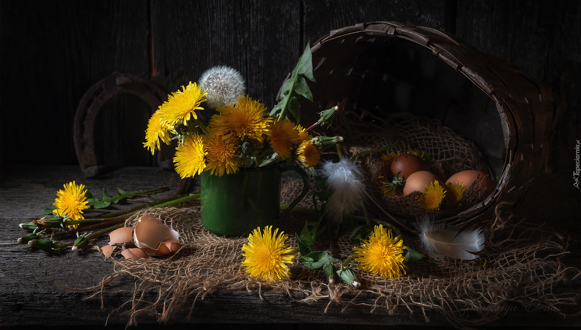 Edytor tapety: Mniszki w garnuszku obok jajek w koszyku
