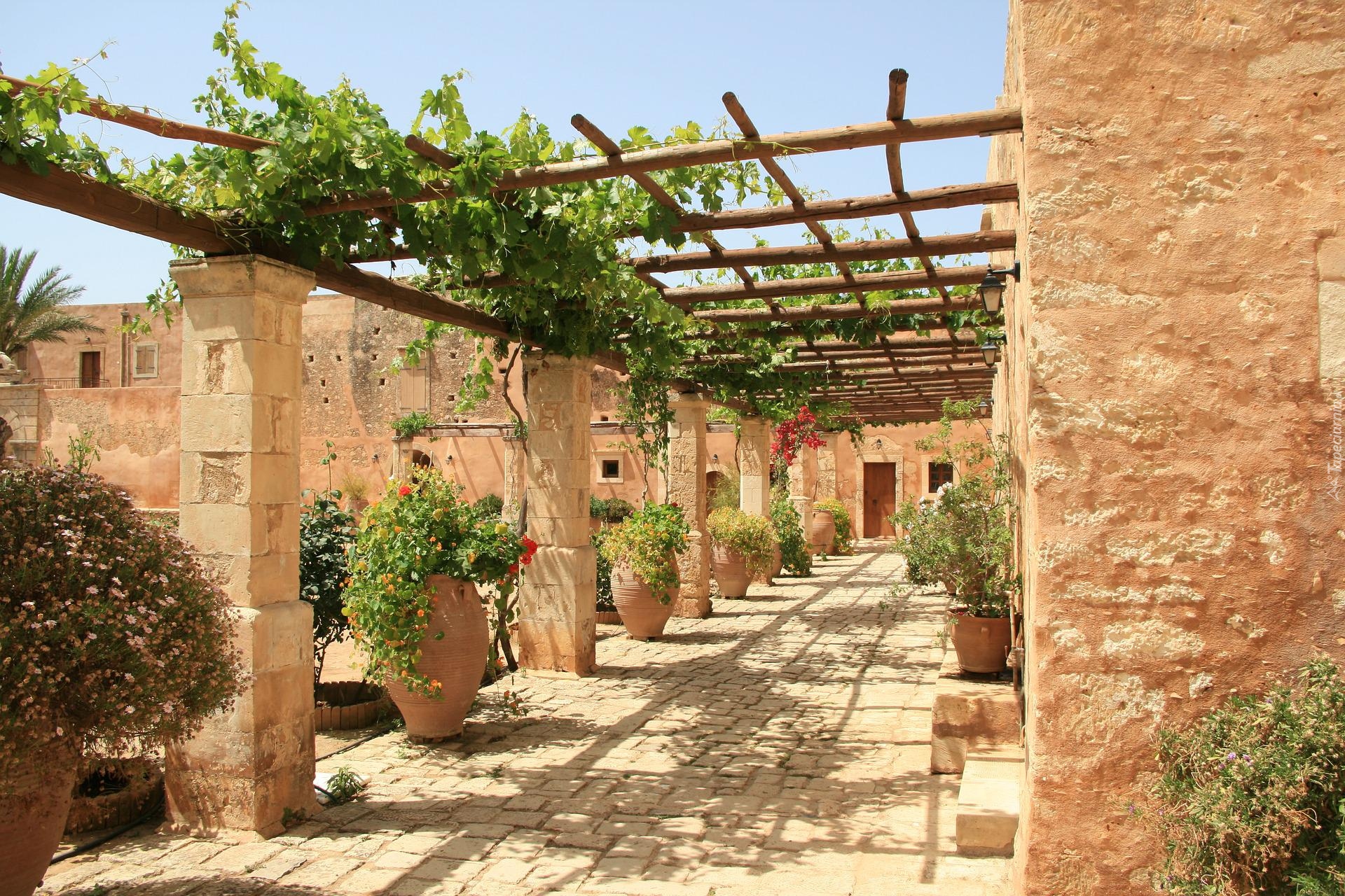 Edytor tapety: Donice z kwiatami na dziedzińcu