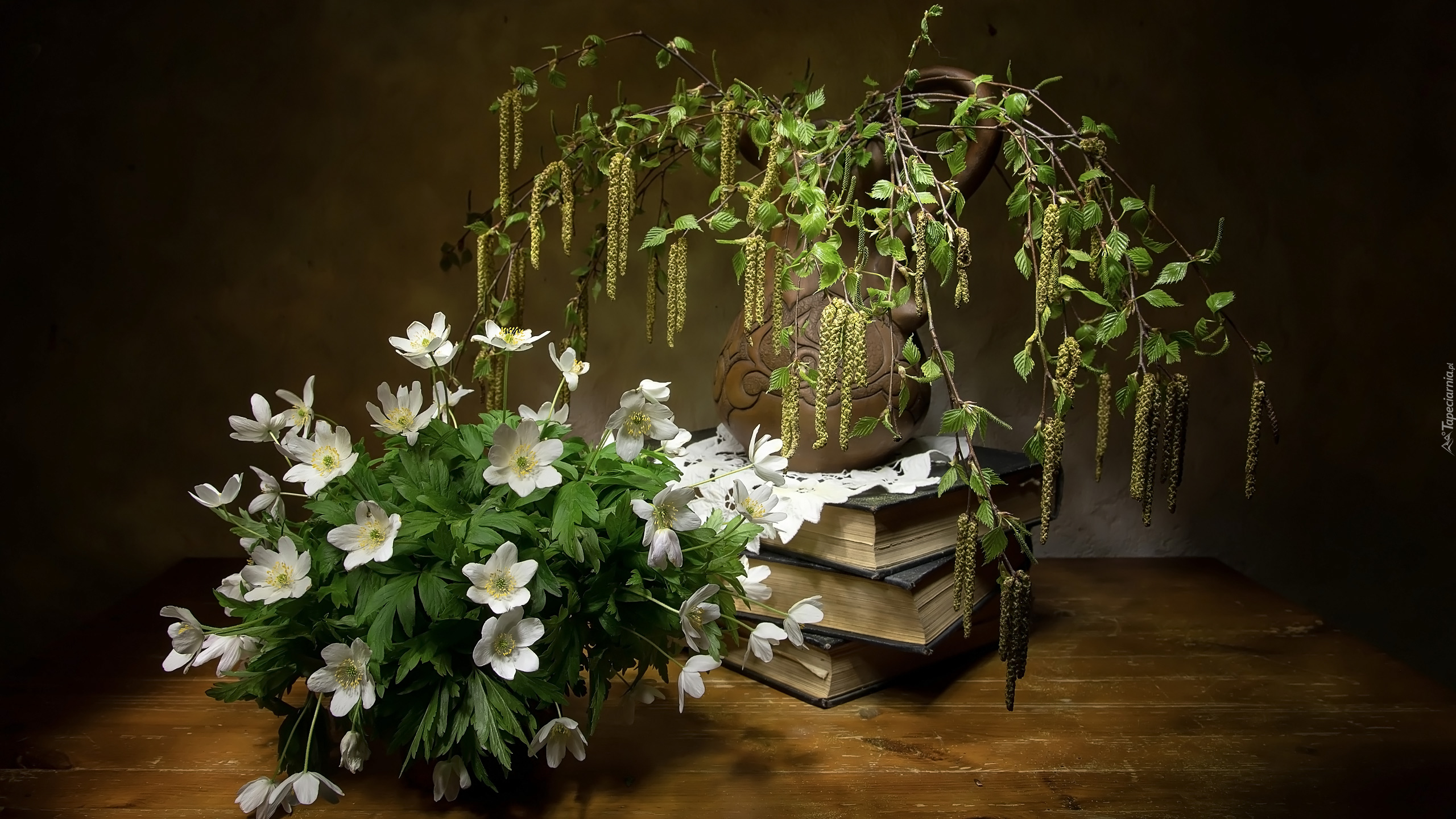 Edytor tapety: Zawilce obok gałązek brzozy w wazonie na książkach