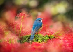 Edytor tapety: Modraczek zwyczajny na pniu wśród czerwonych kwiatów