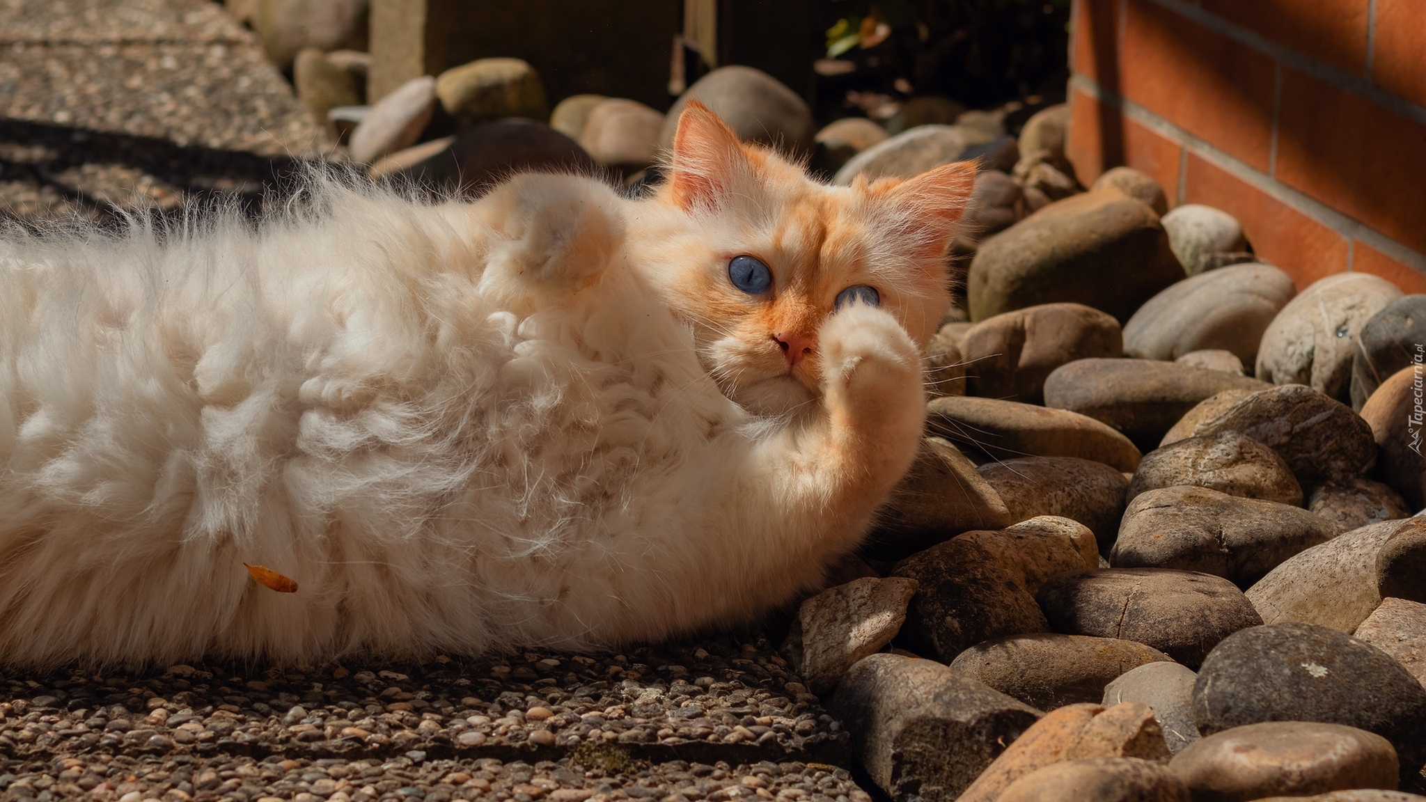Edytor tapety: Rudy kot leżący na kamieniach