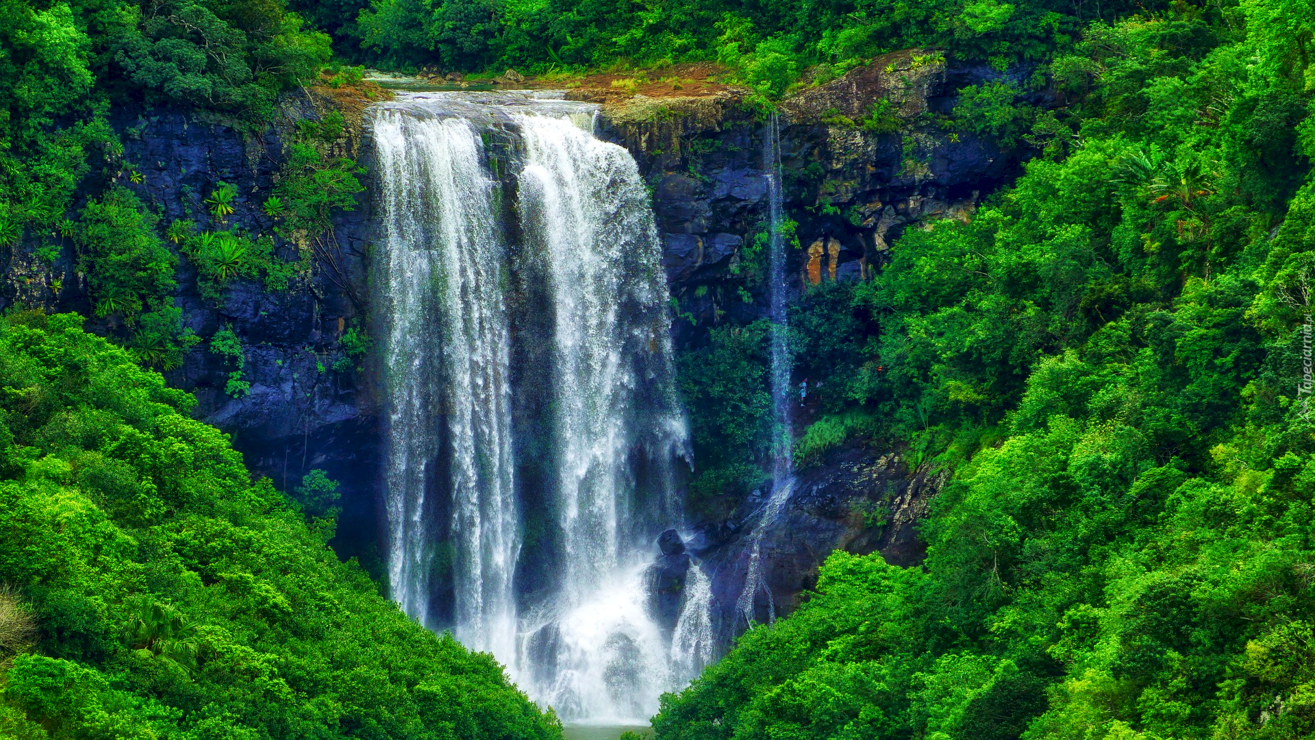 Edytor tapety: Wodospad spływający ze skał w lesie