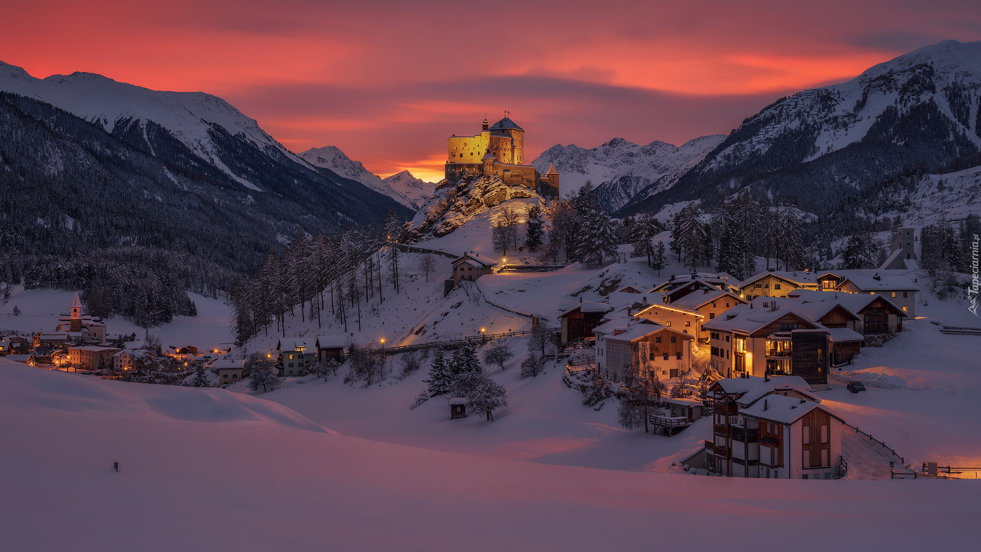 Edytor tapety: Zamek Tarasp na tle ośnieżonych gór