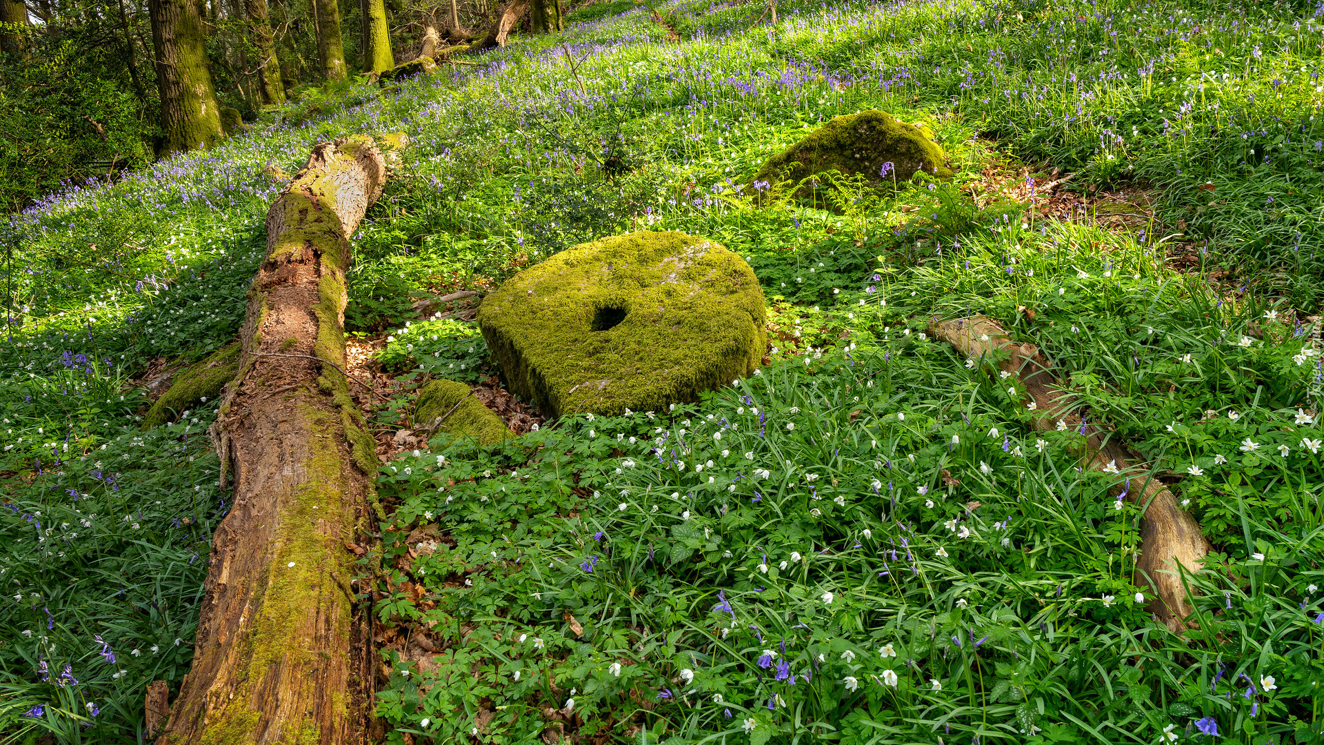 Edytor tapety: Powalony pień drzewa i kwiaty na leśnej polanie