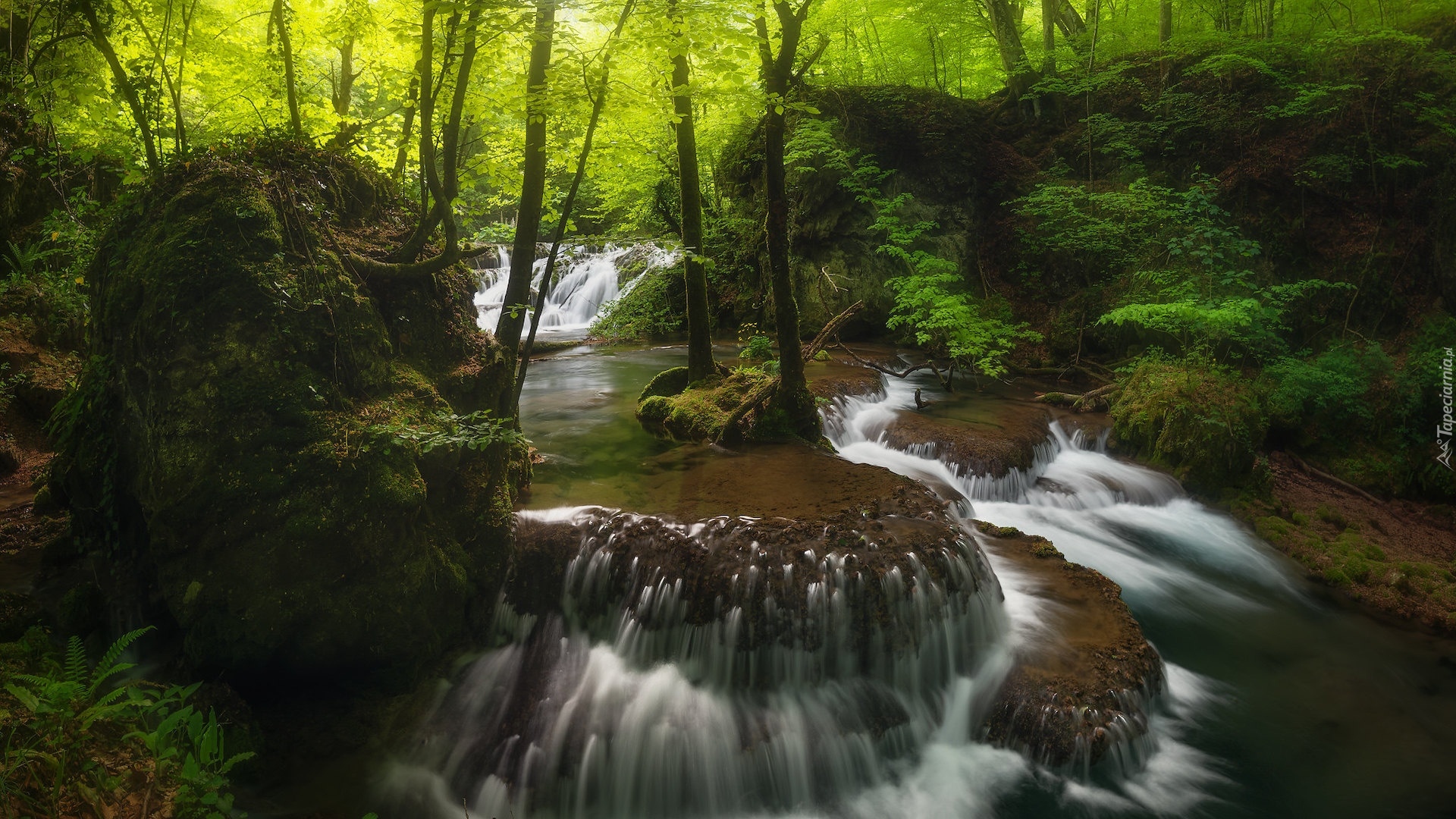 Edytor tapety: Paprocie pod drzewami i kaskada w rzece