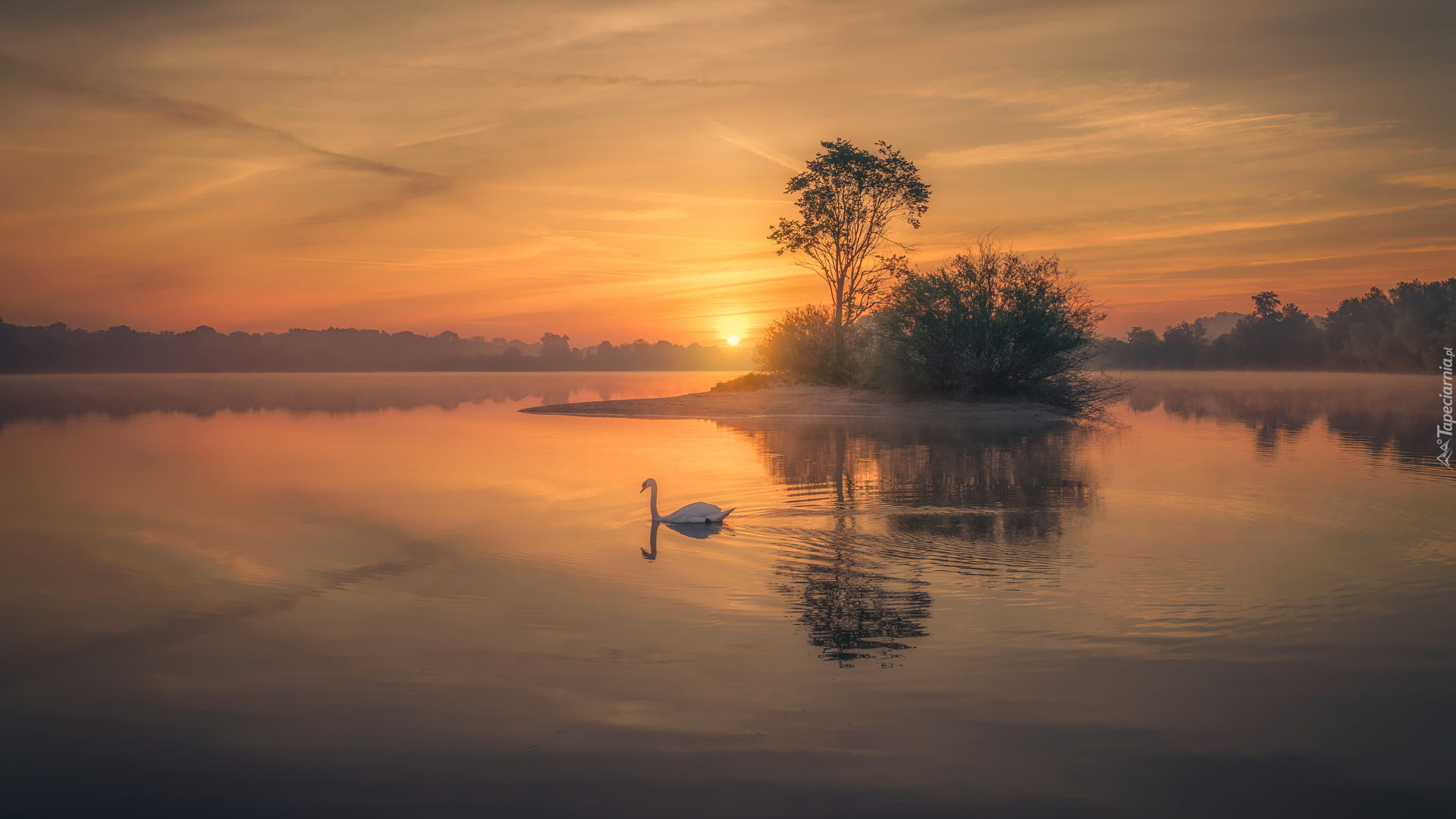 Edytor tapety: Łabędź na zamglonym jeziorze o wschodzie słońca
