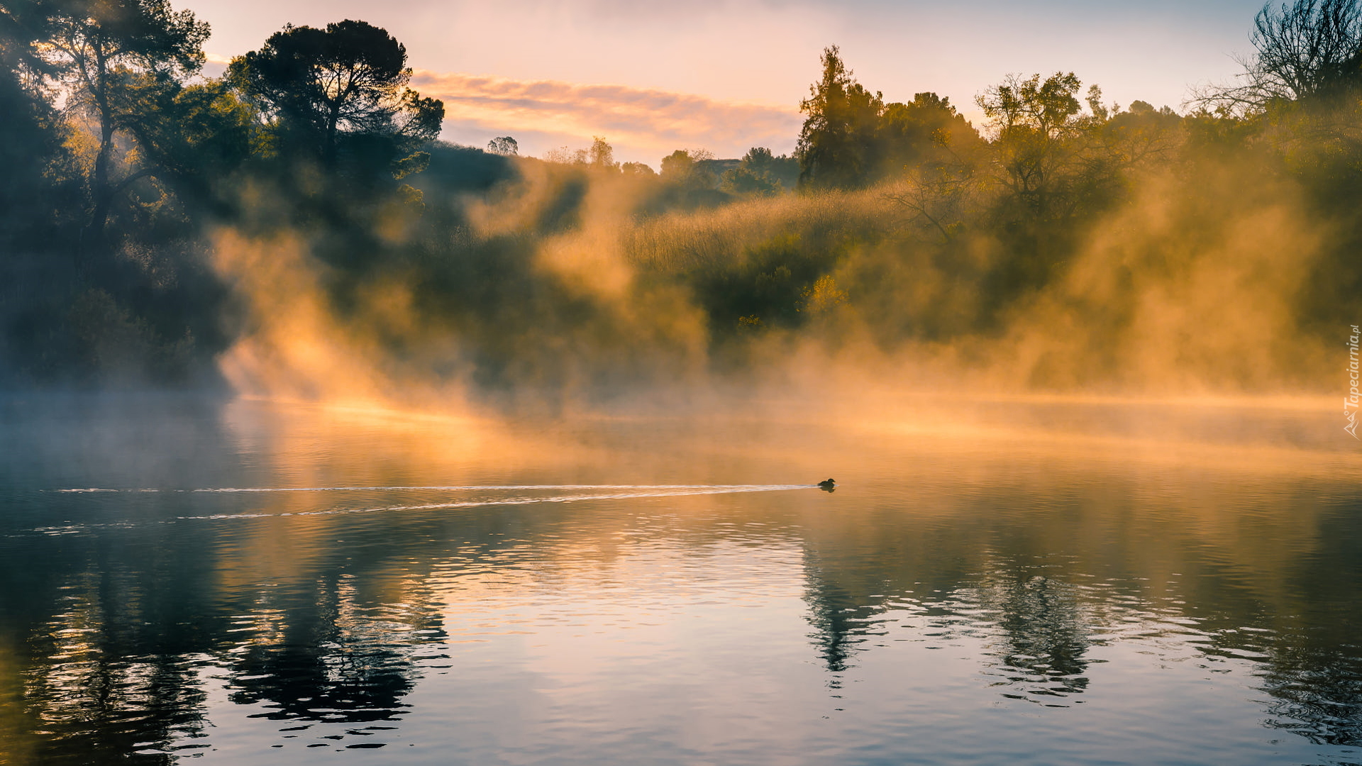 Edytor tapety: Rozświetlona słońcem mgła nad jeziorem