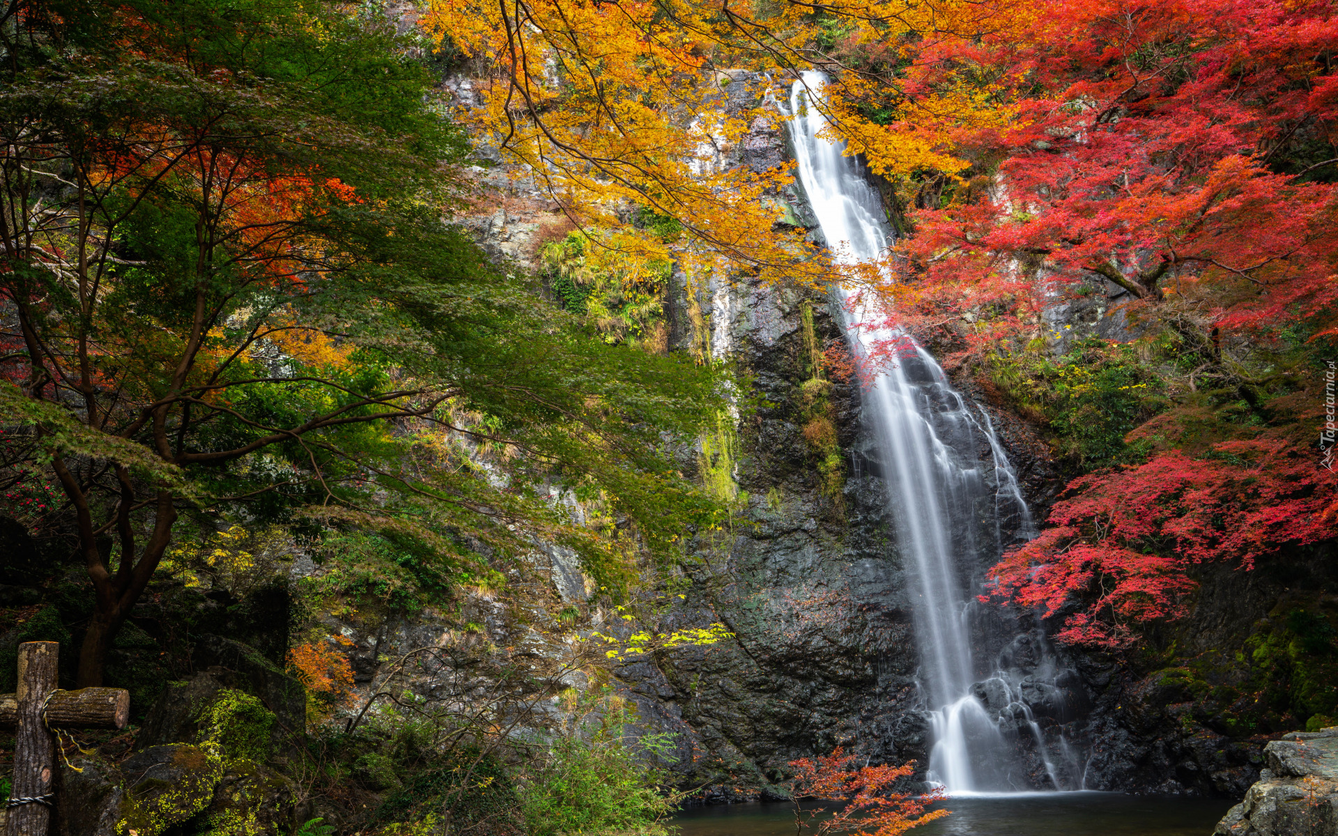Edytor tapety: Widok zza kolorowych drzew na wodospad Minoo