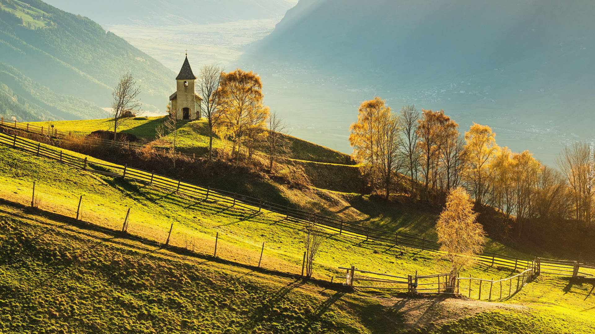 Edytor tapety: Kościół i drzewa na wzgórzu