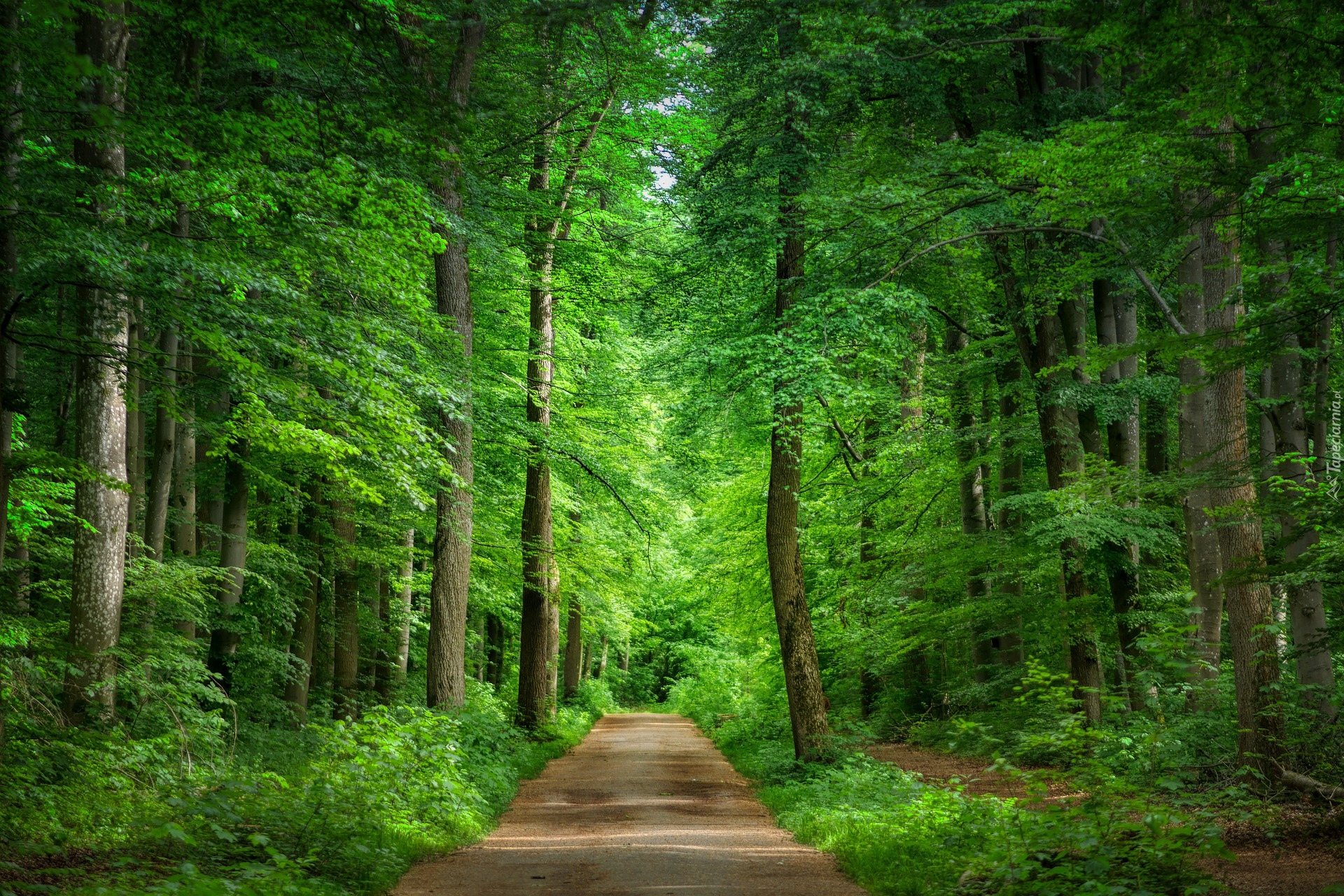 Edytor tapety: Leśna droga między drzewami w lesie
