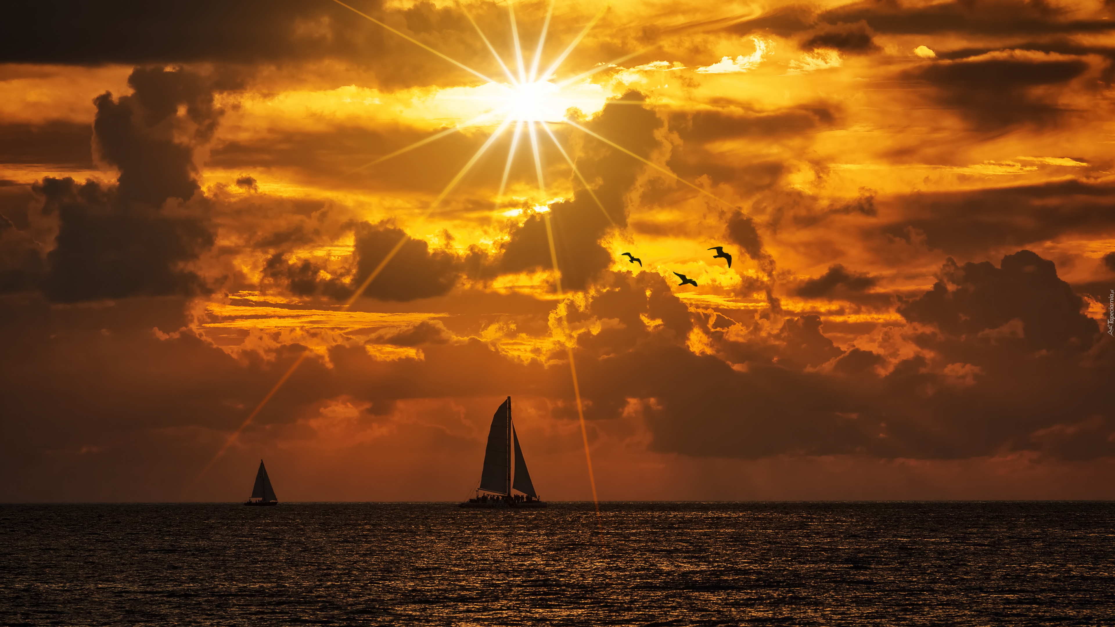 Edytor tapety: Żaglówki na morzu i zachód słońca w tle