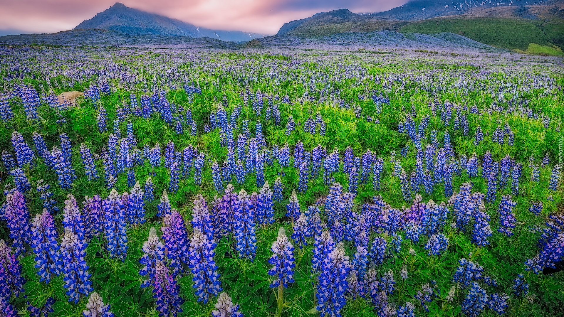 Edytor tapety: Łubinowa łąka i góry w oddali