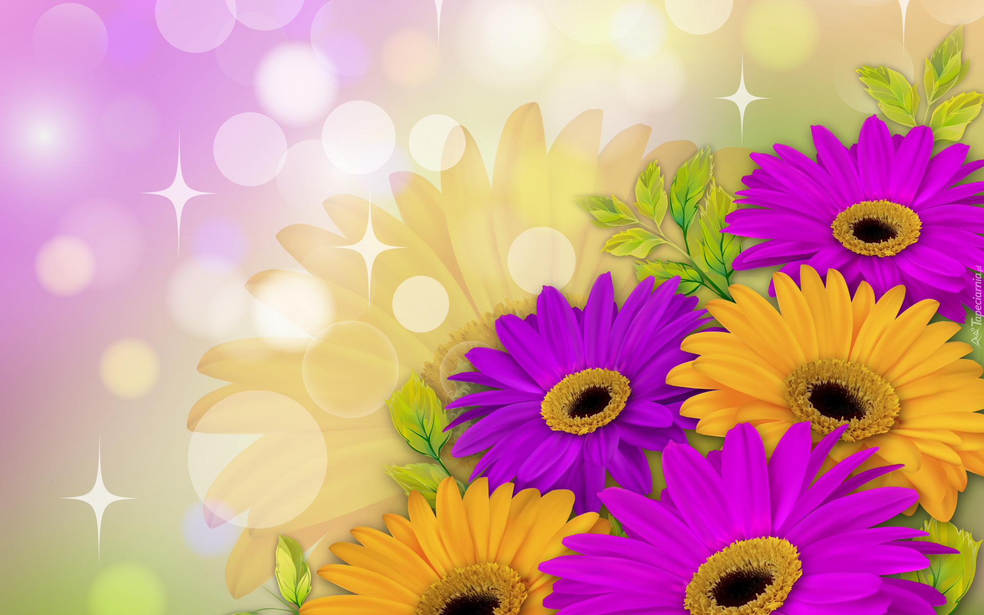Edytor tapety: Żółte i fioletowe gerbery w 2D