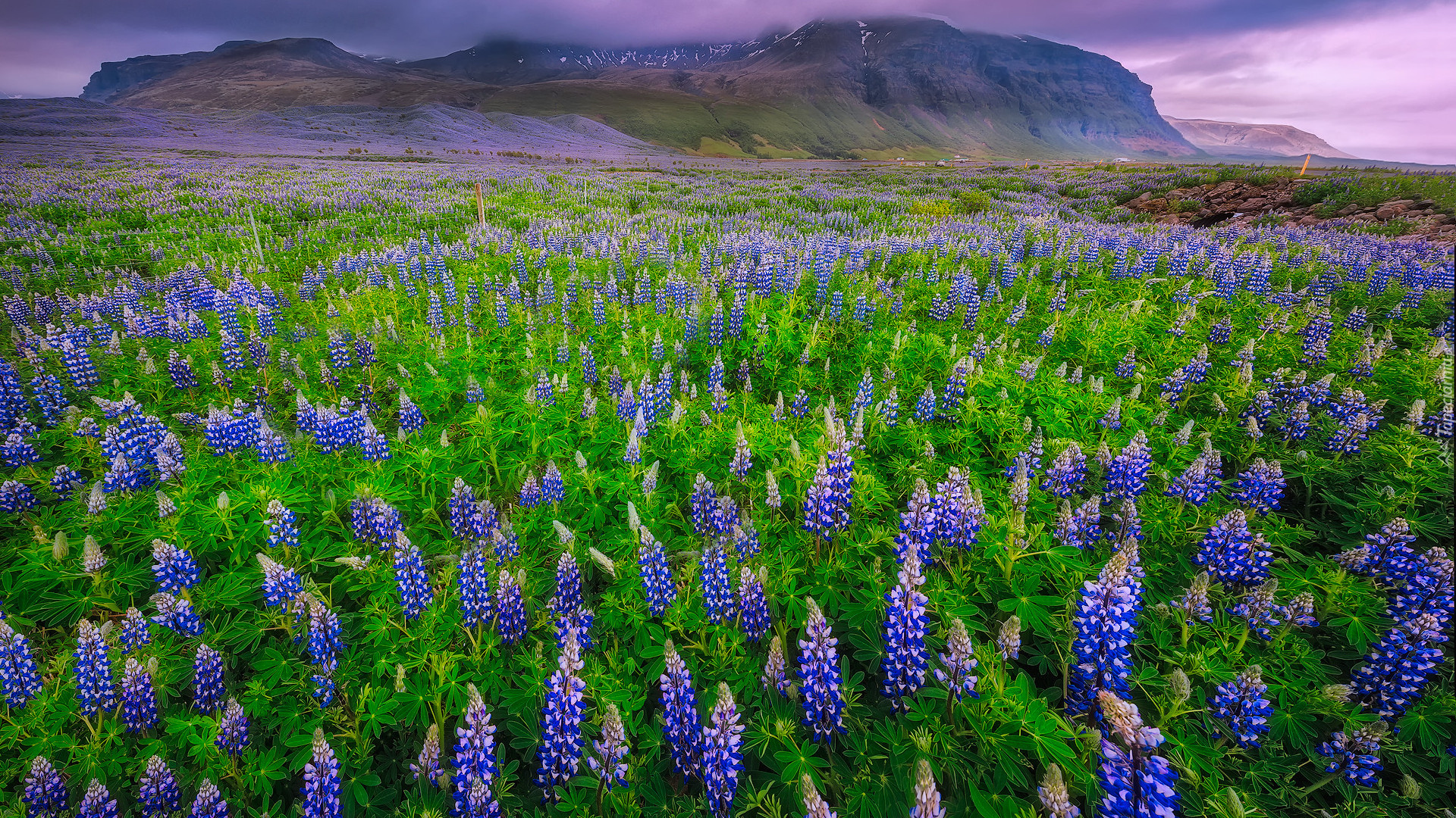 Edytor tapety: Łubiny na łące i mgła nad górami
