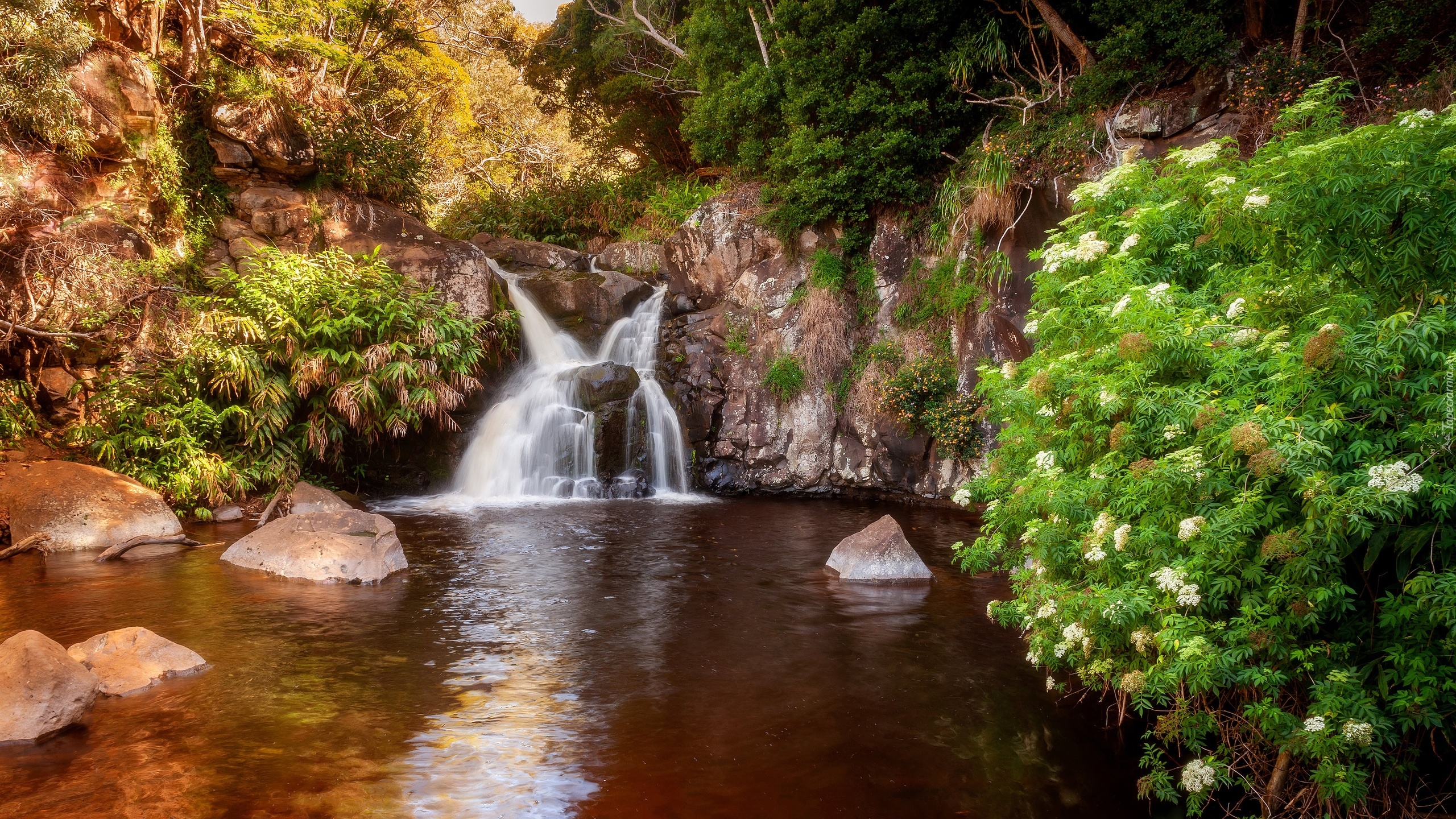 Edytor tapety: Kwitnące krzewy na skale przy wodospadzie