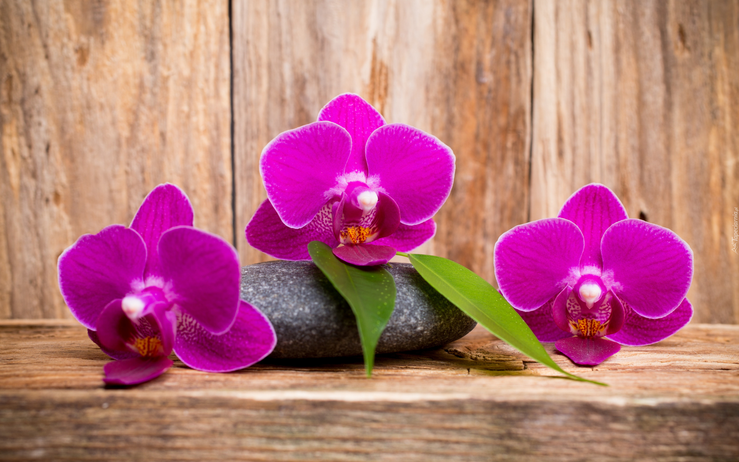 Edytor tapety: Fioletowe storczyki i kamień na drewnie