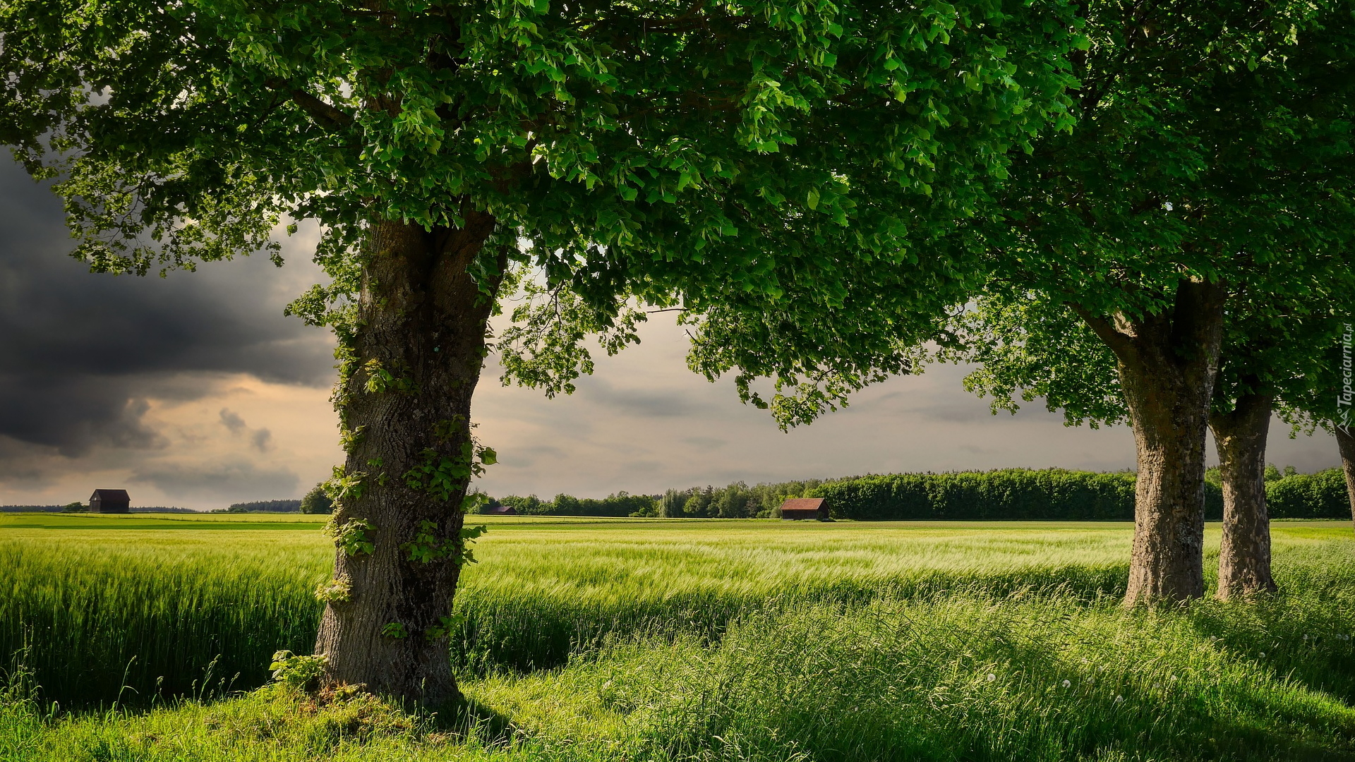 Edytor tapety: Drzewa na polu zboża pod ciemnymi chmurami