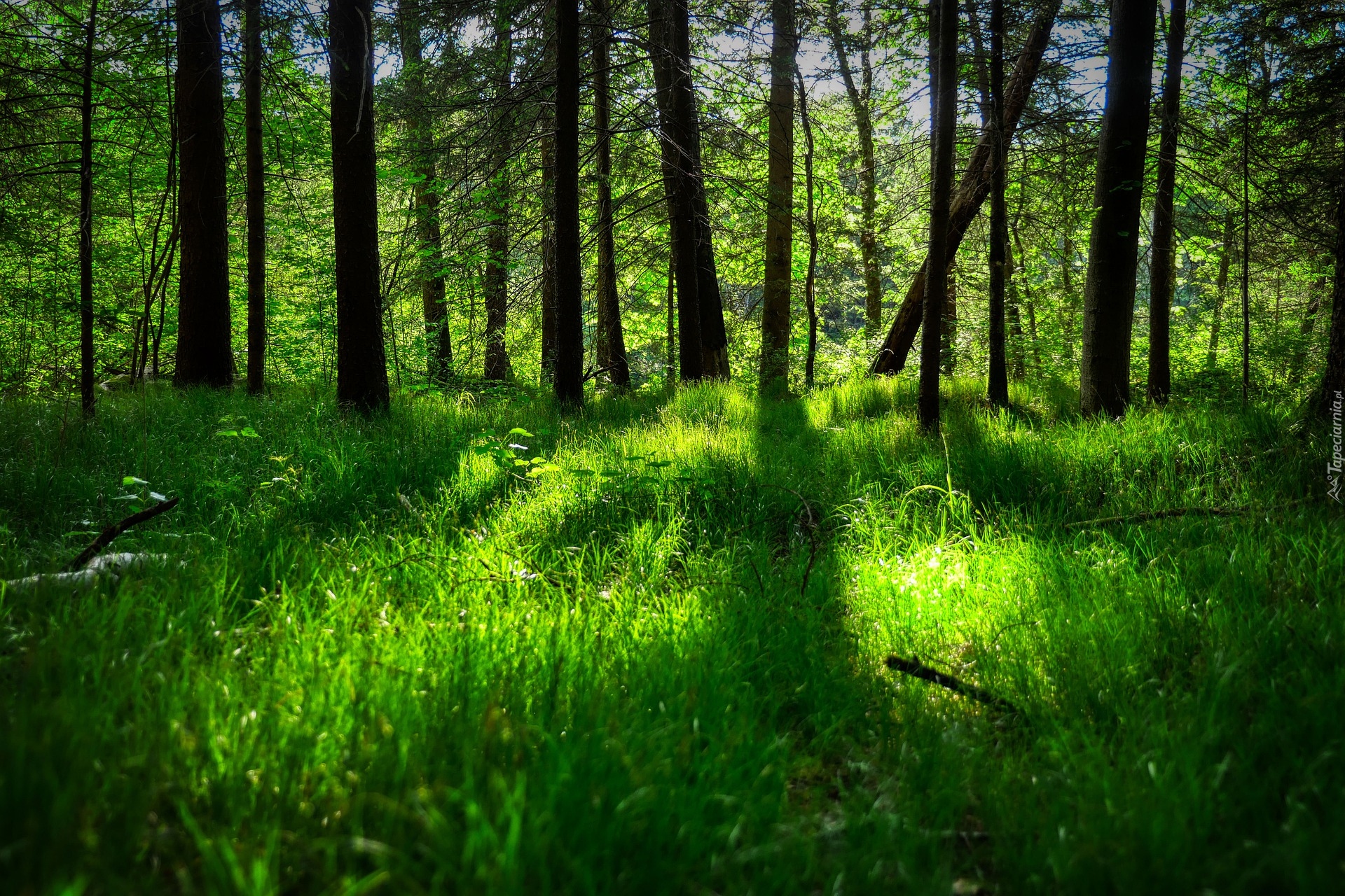 Edytor tapety: Drzewa i trawa w lesie w słonecznym blasku