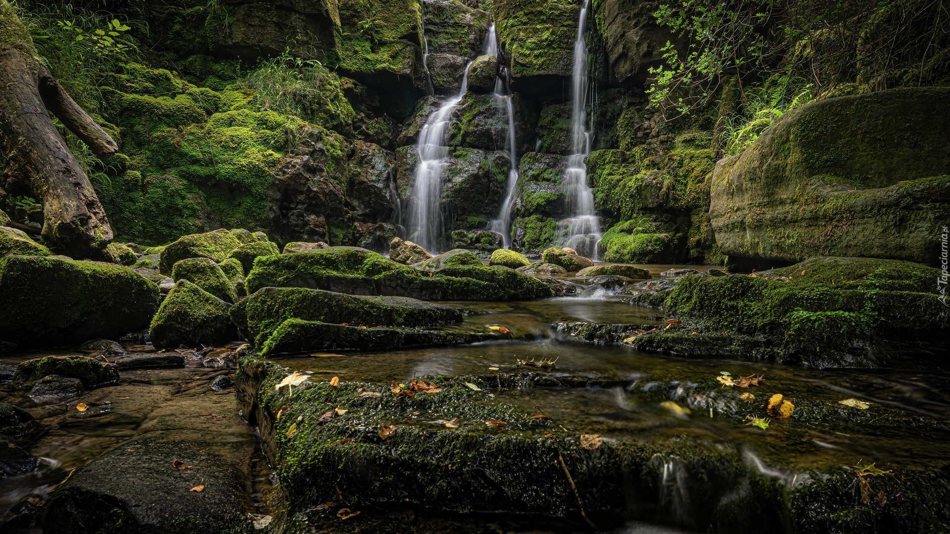 Edytor tapety: Omszone skały i wodospad