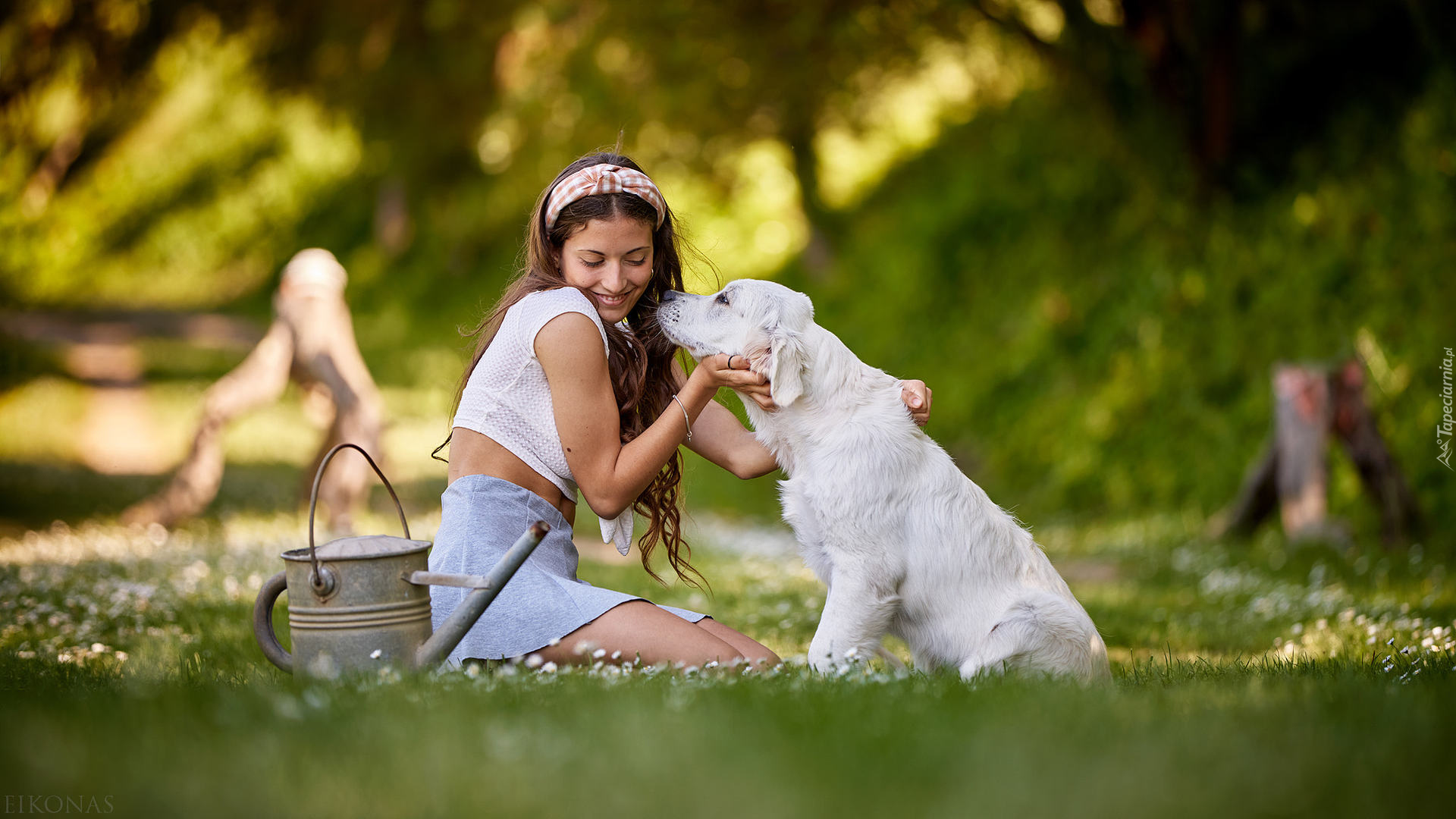 Edytor tapety: Dziewczyna ze szczeniakiem golden retrievera na łące