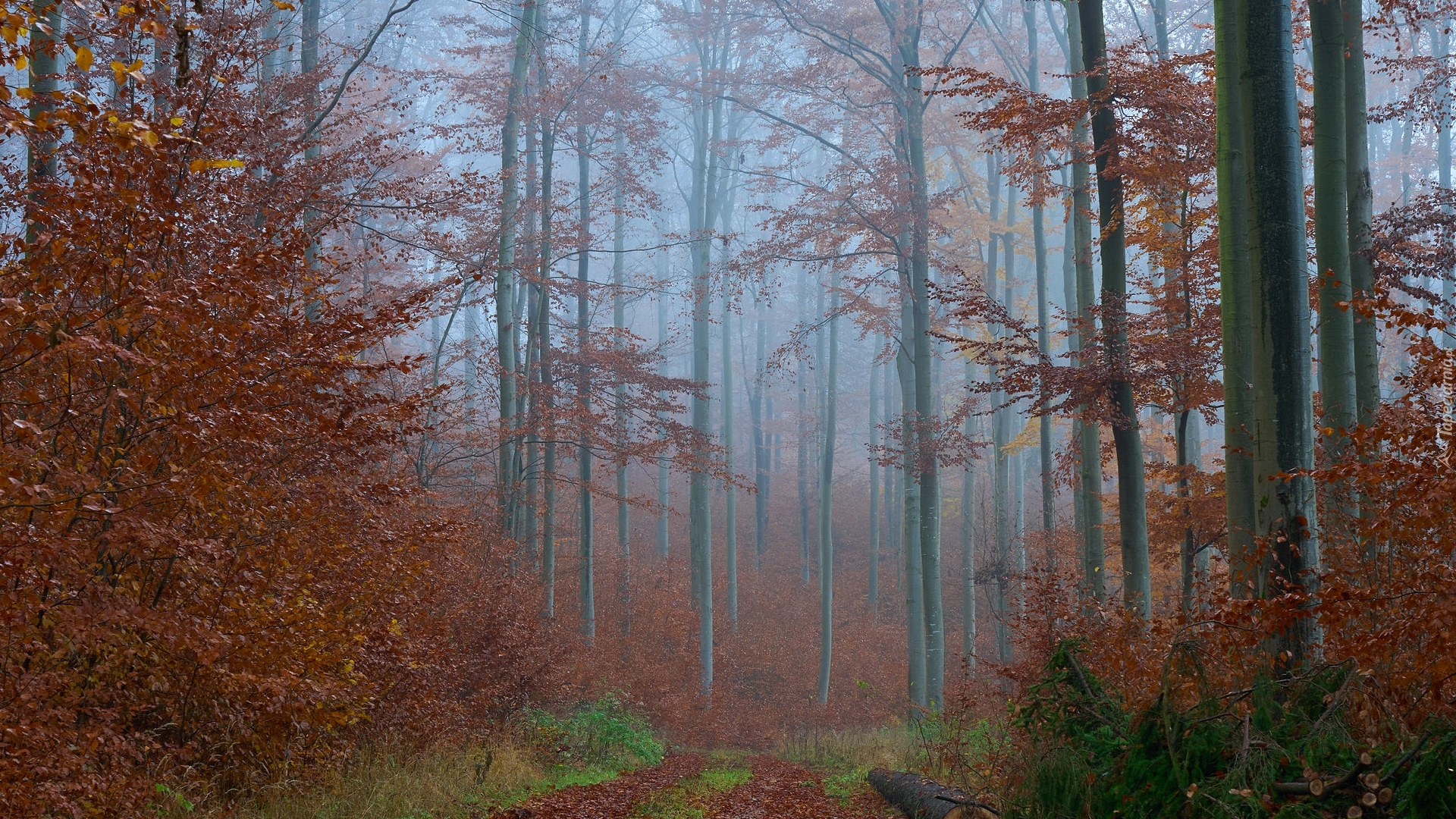 Edytor tapety: Zrudziałe drzewa w zamglonym lesie