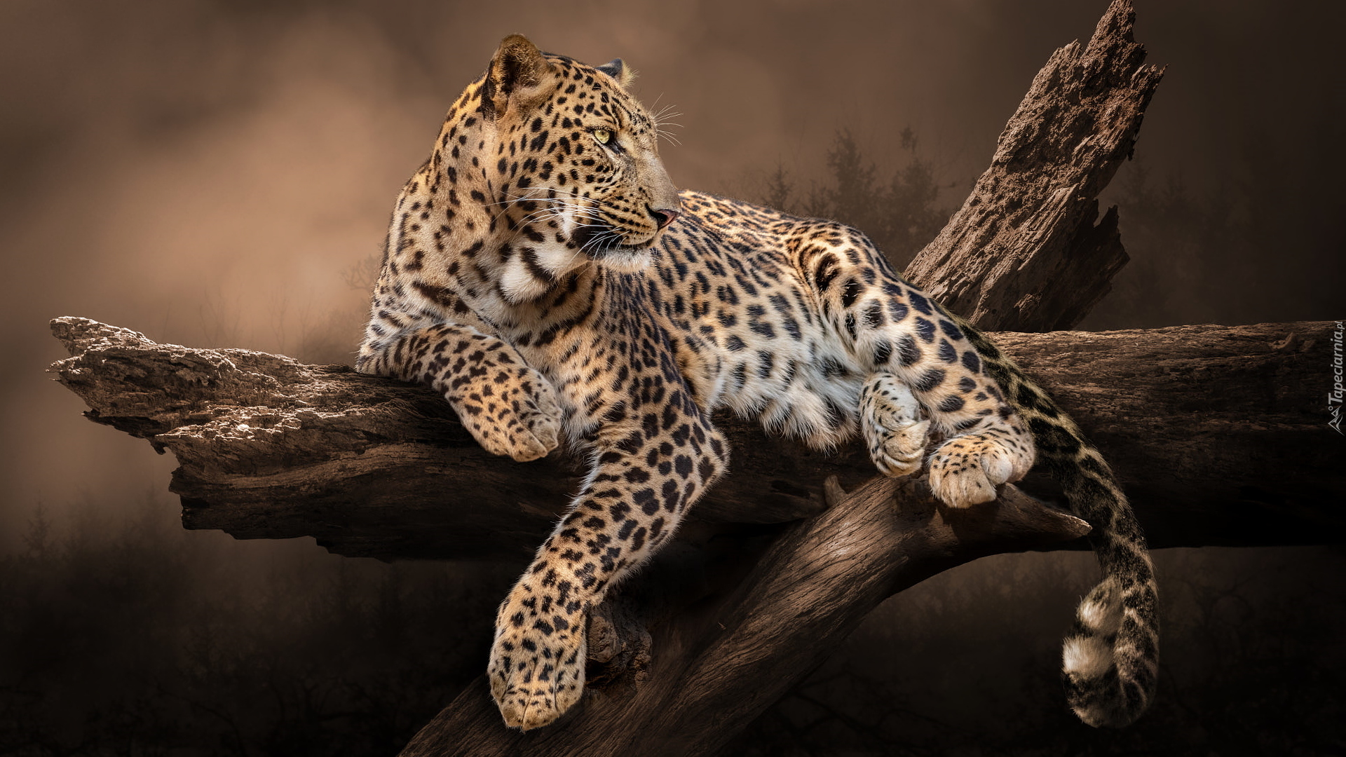 Edytor tapety: Lampart leżący na suchym konarze drzewa