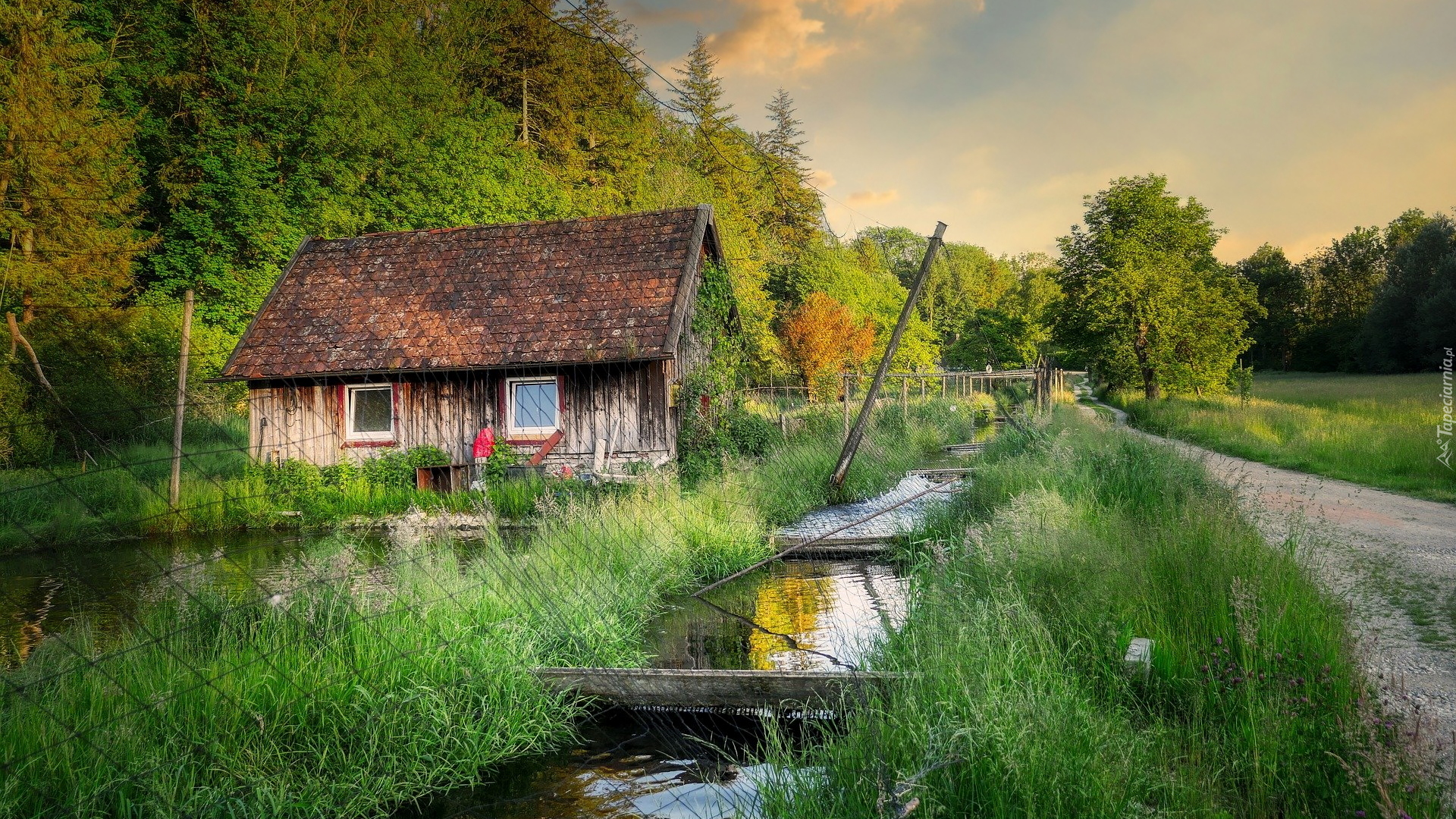 Edytor tapety: Drewniany domek obok hodowli ryb pod lasem