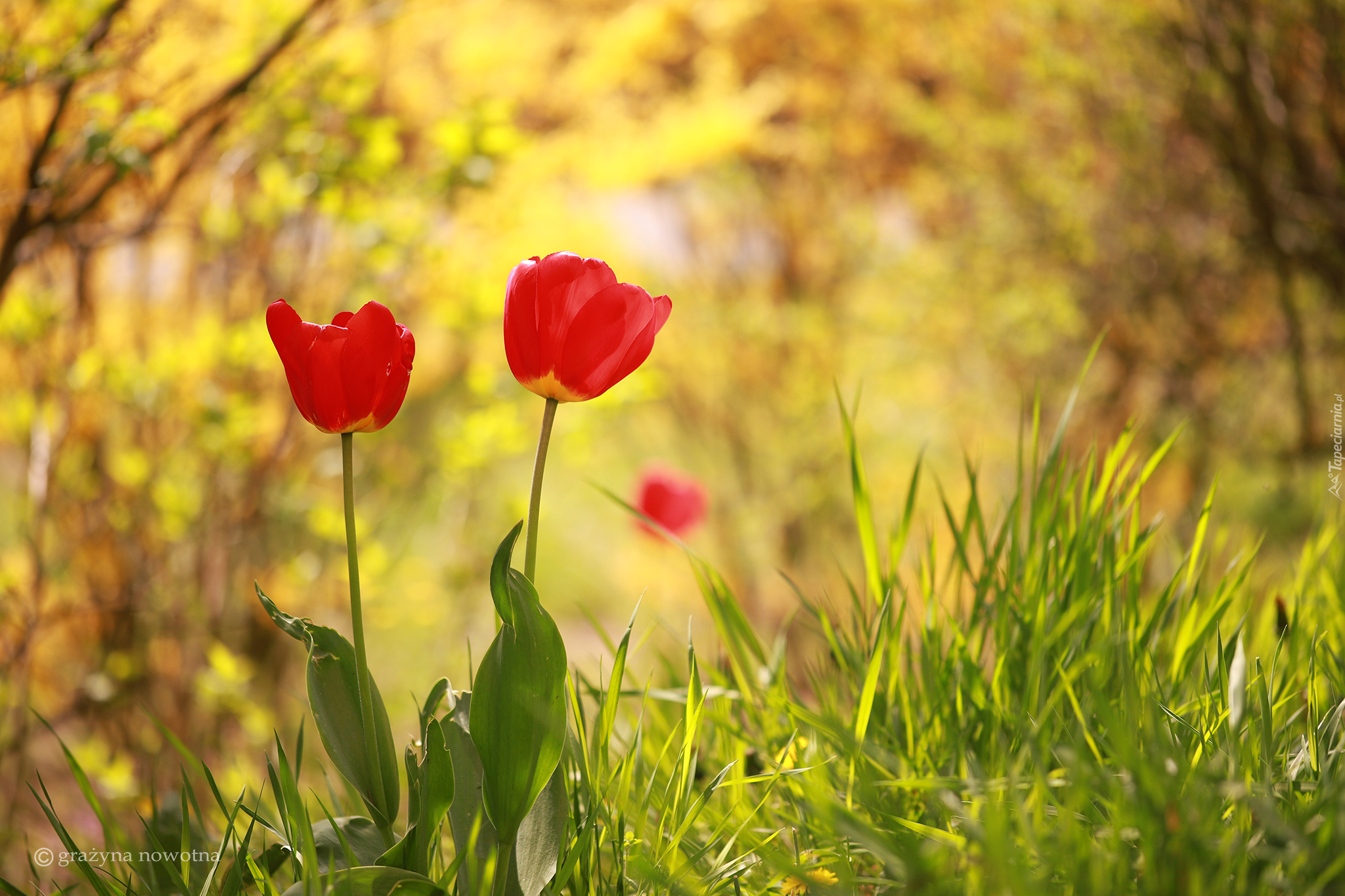 Edytor tapety: Dwa czerwone tulipany w trawie