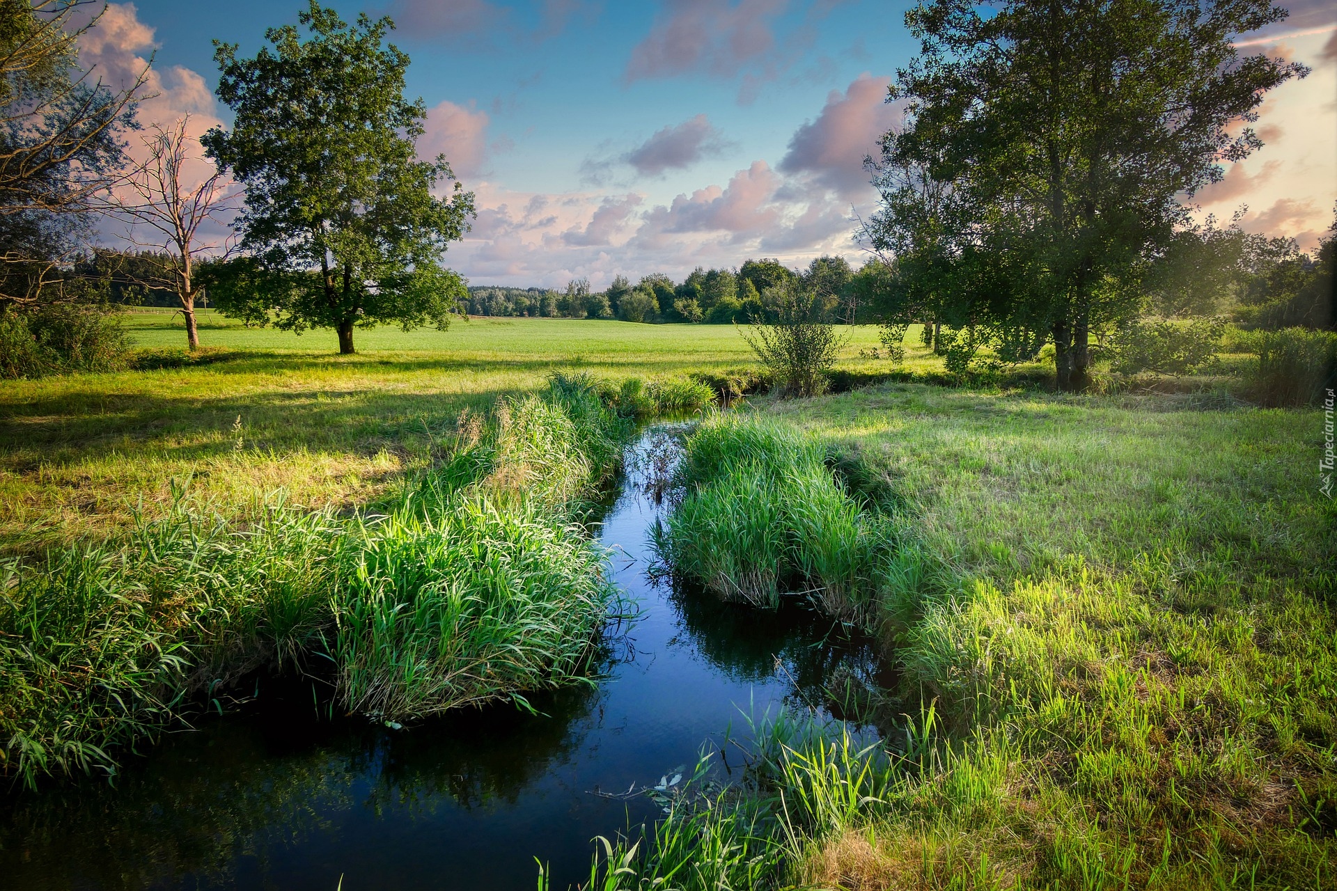 Edytor tapety: Drzewa nad strumieniem na zielonej łące