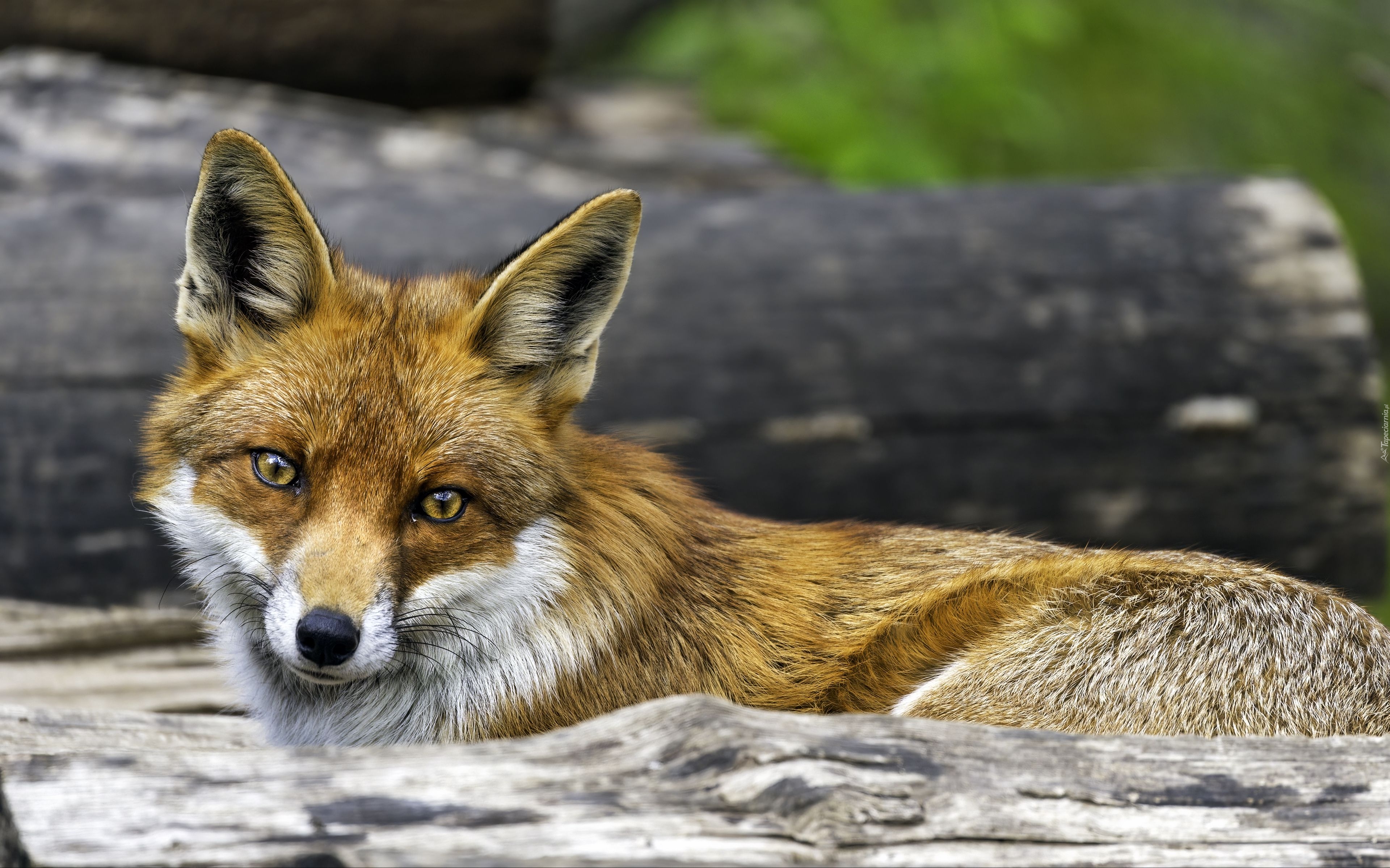 Edytor tapety: Lis leżący przy kłodzie drzewa