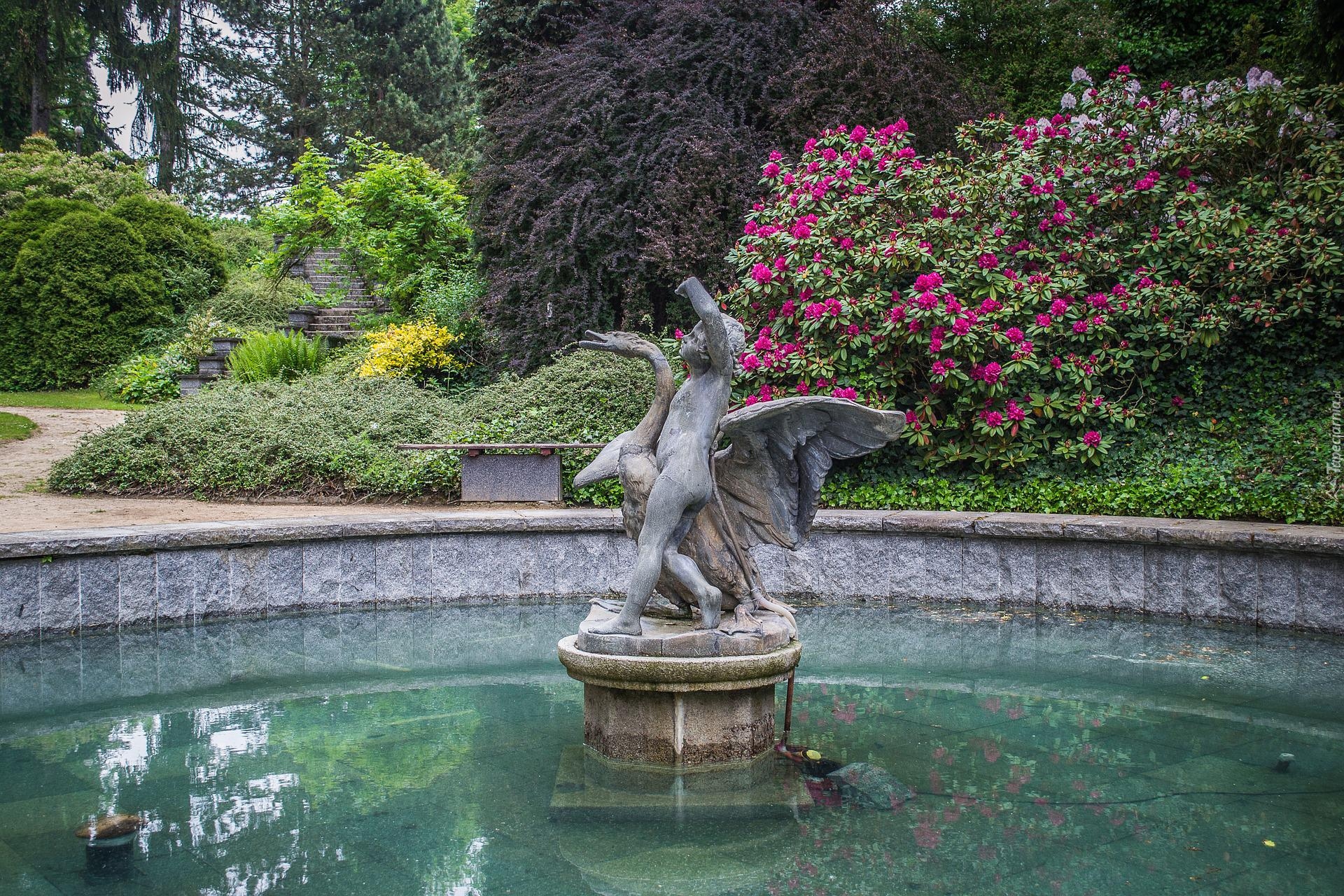Edytor tapety: Rododendrony obok fontanny w parku