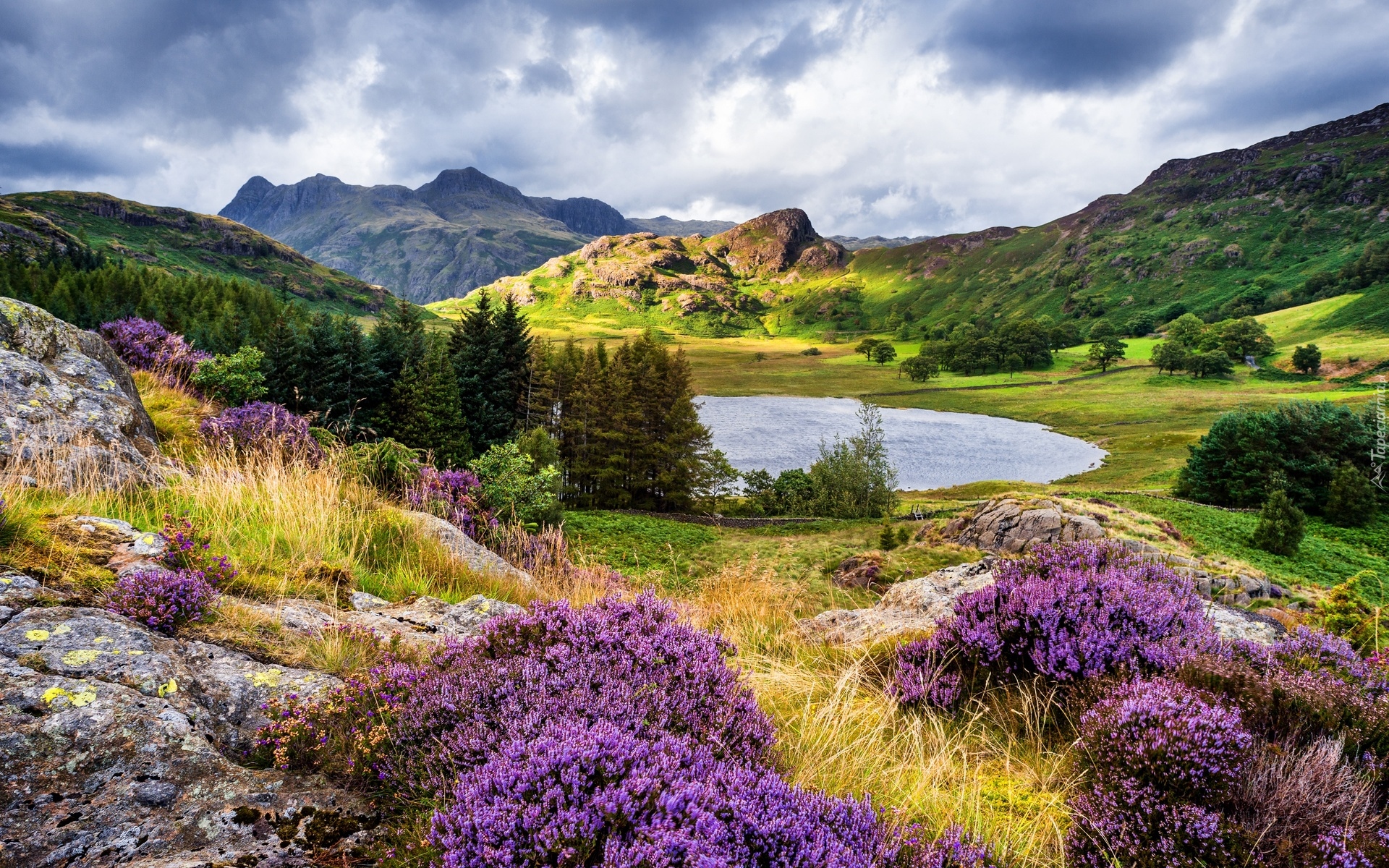 Edytor tapety: Wrzosy na skałach i górskie jezioro w tle
