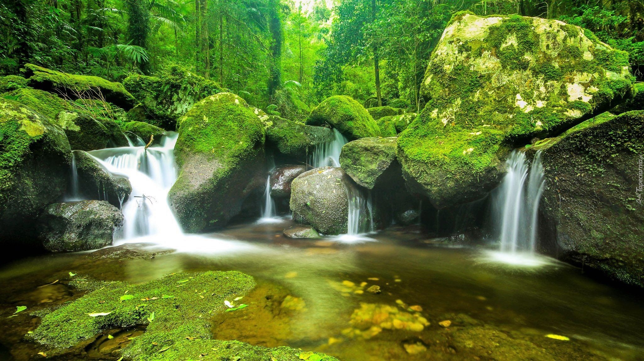 Edytor tapety: Rzeka spadająca po omszonych kamieniach w zielonym lesie