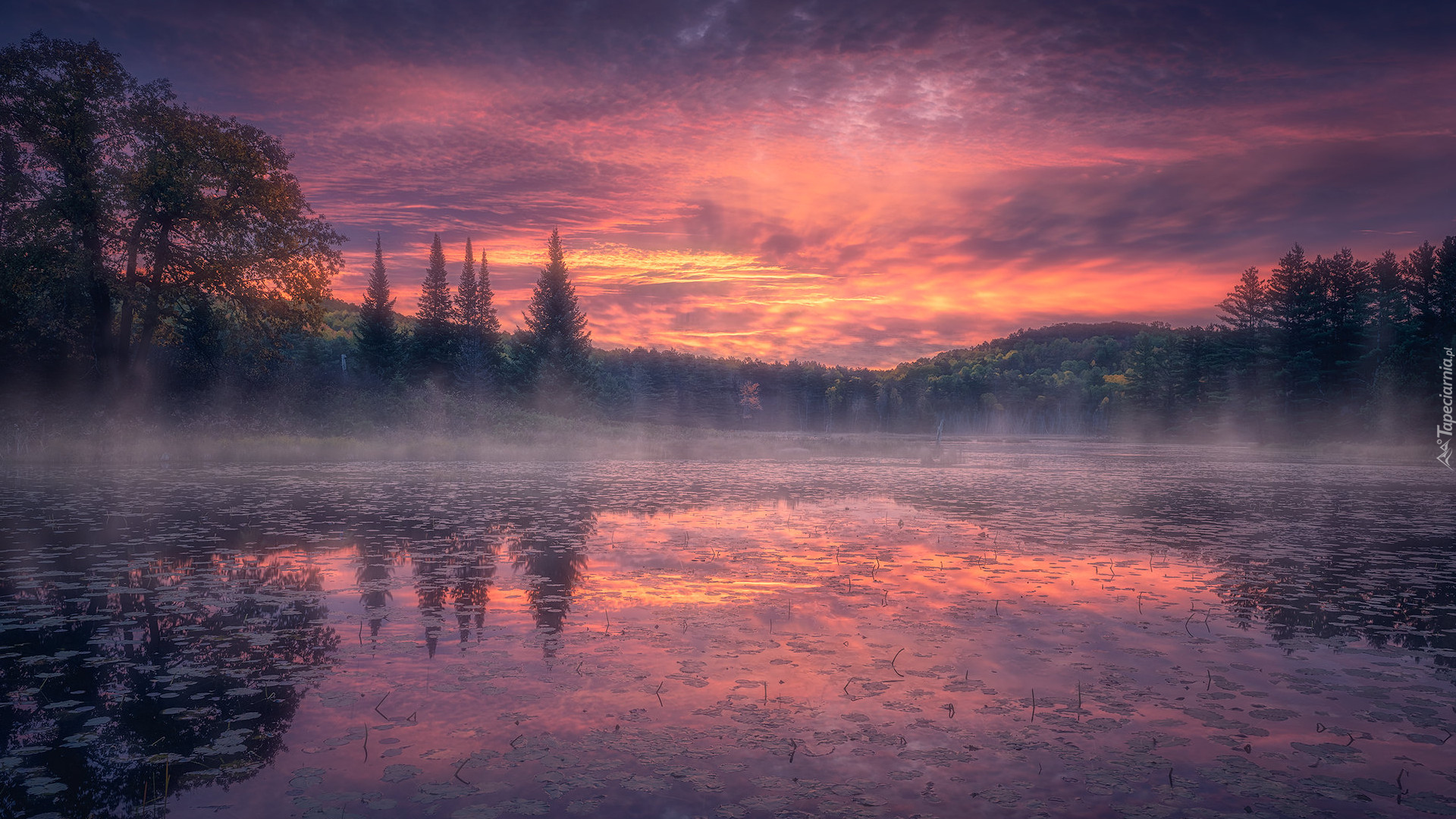 Edytor tapety: Zaróżowione niebo nad zamglonym jeziorem