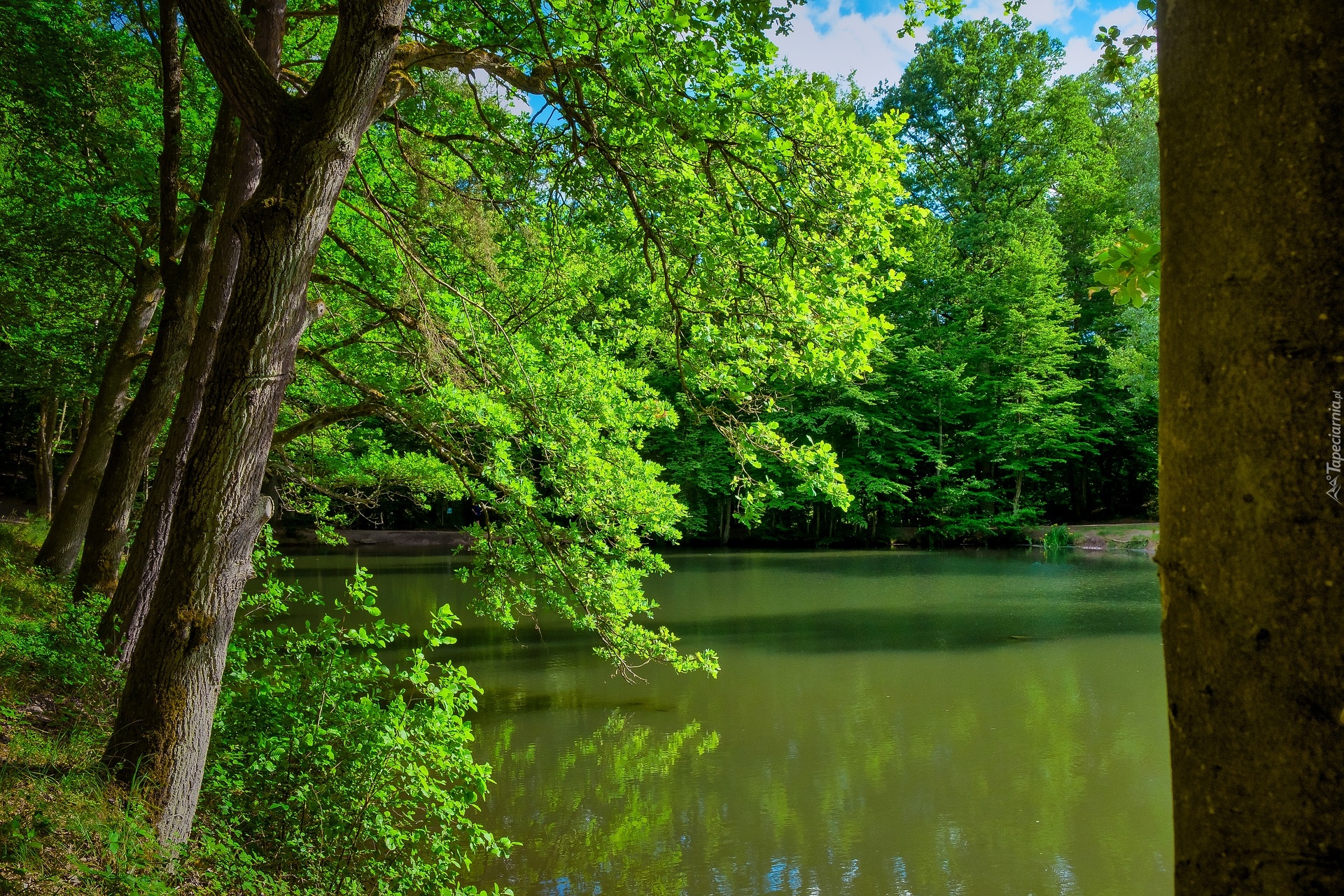 Edytor tapety: Rozświetlone zielone drzewa nad jeziorem