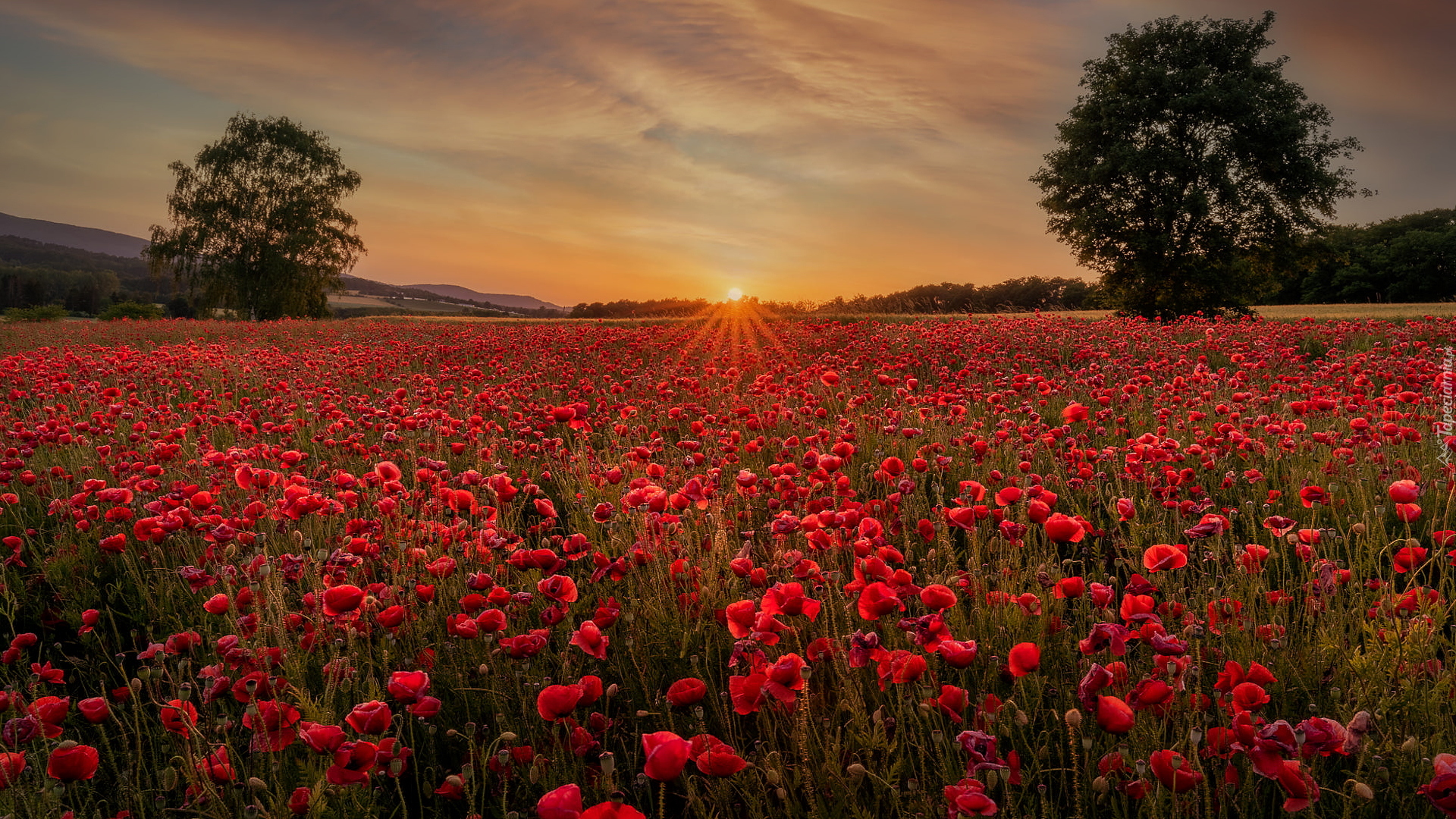 Edytor tapety: Dwa drzewa na polu maków
