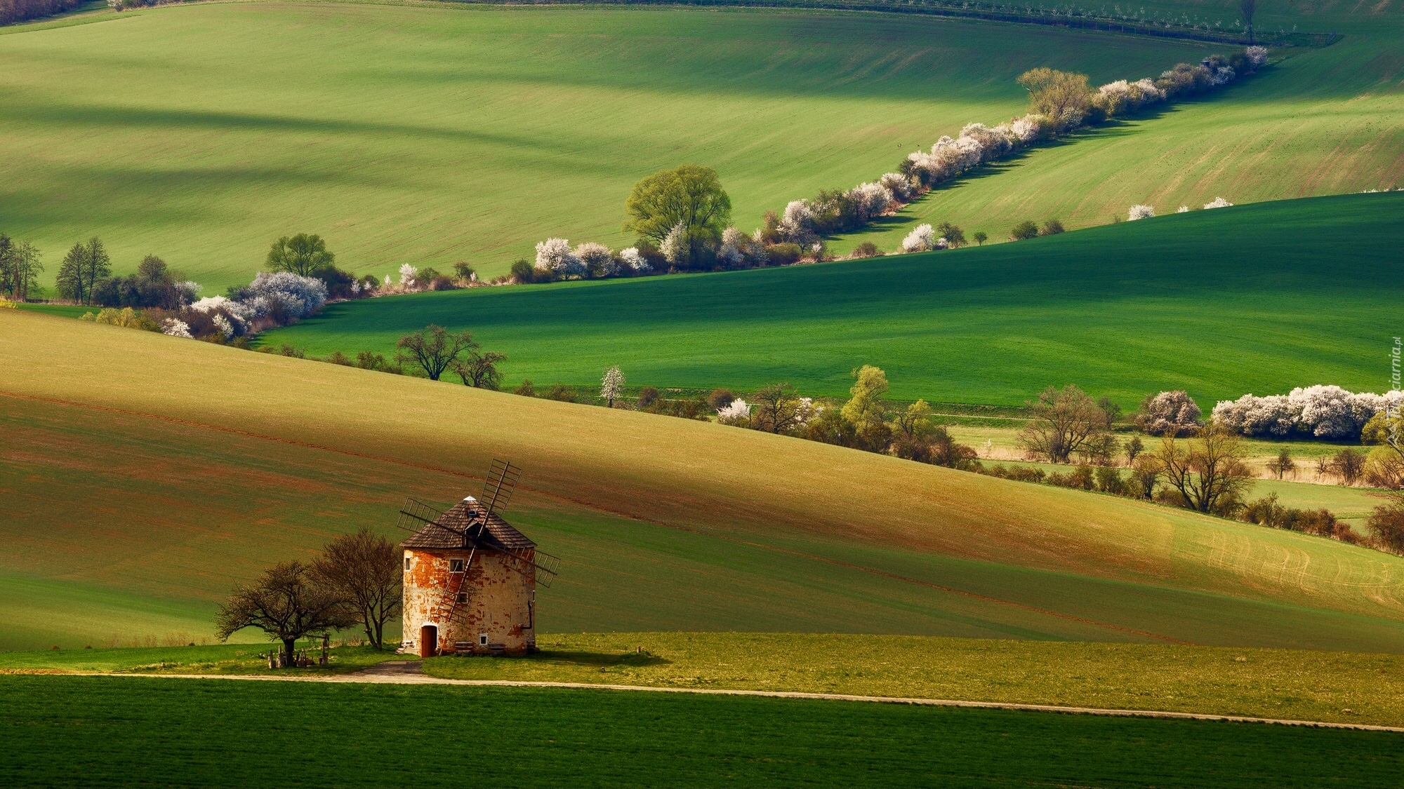 Edytor tapety: Drzewa i wiatrak na polach Południowych Moraw