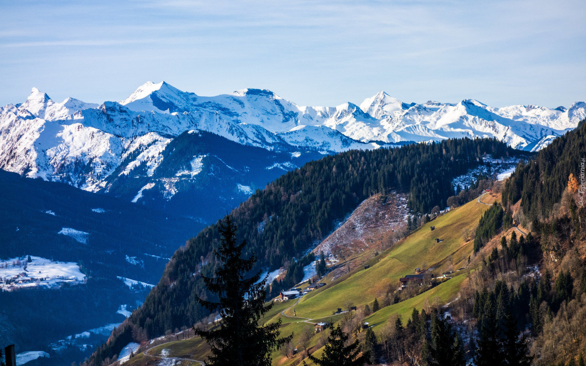 Edytor tapety: Ośnieżone szczyty i las na wzgórzu