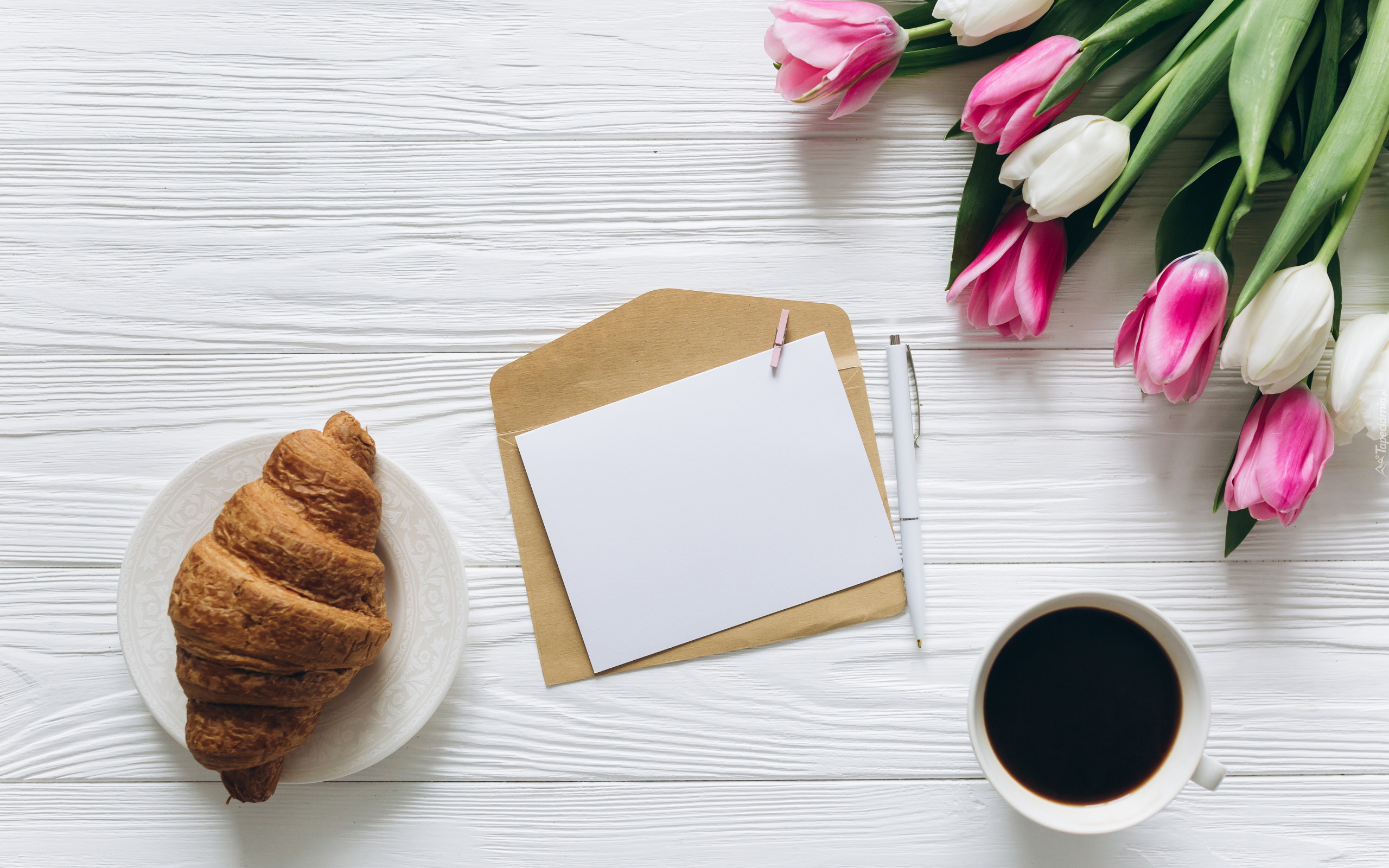 Edytor tapety: Tulipany obok kawy i rogalika